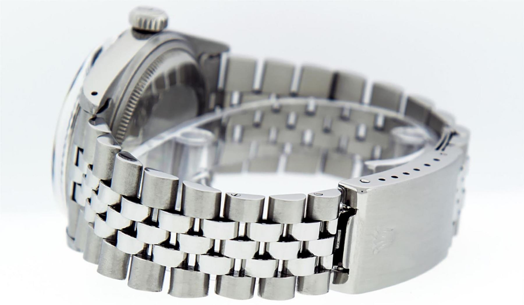One Stainless Steel Rolex Datejust Polished Bright with Satin Finish, This Watch Has Been Serviced & Electronically Tested, Stainless Steel Case: 36mm, Stainless Steel Crown, Bezel: 14K White Gold Fluted Bezel. Custom Crystal: New Acrylic Cyclops Lens. Custom Hands: New Luminescent Hands. Movement: Automatic Winding Movement. Custom Dial: Slate Grey Diamond Dial With Diamond Hour Markers And Roman Track, Diamond Count: 10 Diamonds in Dial G To H In Color, SI-VS Clarity. Date Window: 3 O'Clock Position Date Display, Quickset, Model: Datejust, Condition: G-6 Extra Fine. Bracelet: Stainless Steel Jubilee. Bright Polish & Satin Finish. 7.0 Inch Length, Adjustable. Standard Clasp, With Rolex Logo. This Watch Has Been Serviced Time Tested And Is In Excellent Condition It Is Free Of All Scratches And Dents.