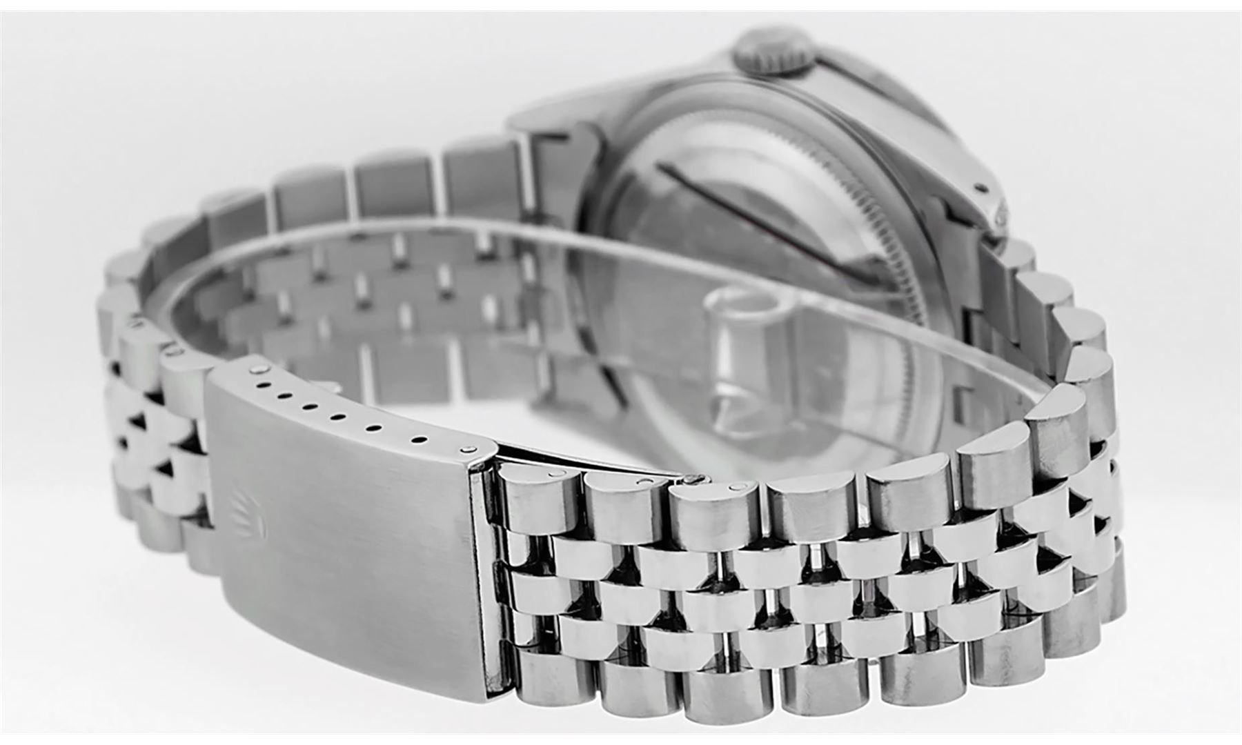 One Pre Owned Stainless Steel 36MM Rolex Datejust Polished Bright with Satin Finish, Serviced & Electronically Tested, Rolex Stainless Steel Case: 36mm, Custom Diamonds On Lugs: 28 Added Diamonds On Lugs. Custom Bezel: New 18K White Gold Pyramid Diamond Bezel, Diamond Count: 24 Diamonds On Bezel. Custom Crystal: New Sapphire With Magnified Date Window. Custom Hands: New Solid Hands. Rolex Movement: Automatic Winding Movement 3035. Custom Dial: Custom Silver With Added Diamonds, Diamond Count: 10 Diamonds On Dial. Date Window: 3 O'Clock Position Date Display, Quickset, Model: Datejust Condition: G-6 Extra Fine. Rolex Bracelet: Stainless Steel Jubilee Band. Bright Polish & Satin Finish. 7.0 Inch Length, Adjustable. Standard Clasp, With Rolex Logo. This Watch Has Been Serviced And Polished And Its Free Of All Dents And Scratches.
