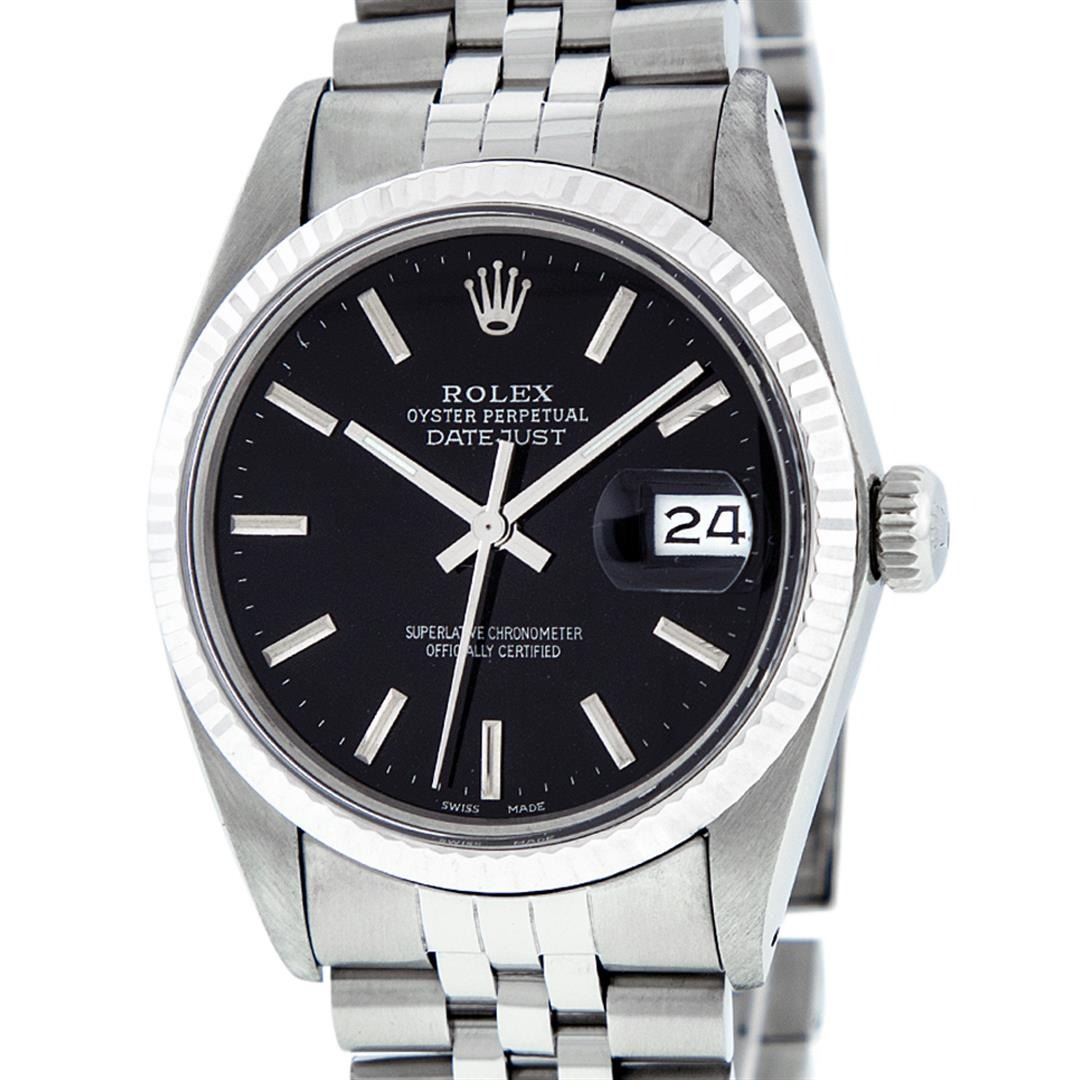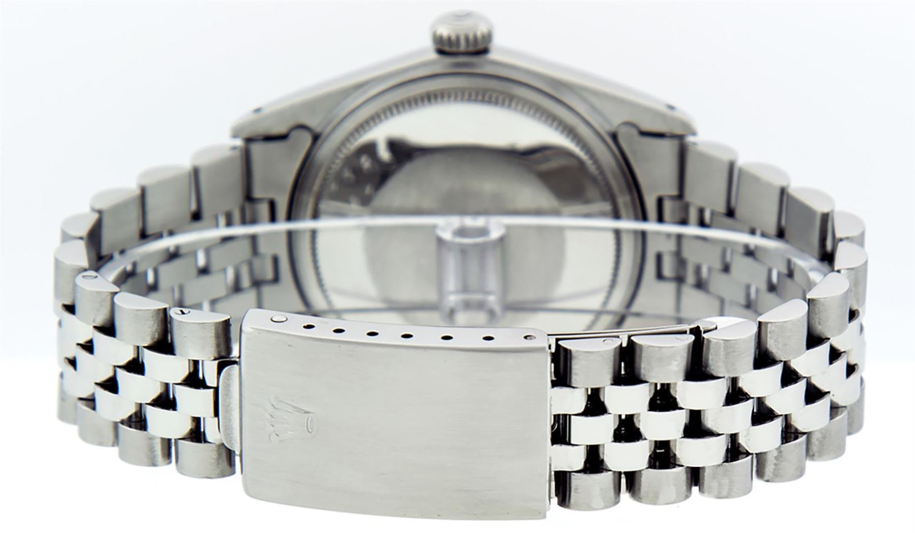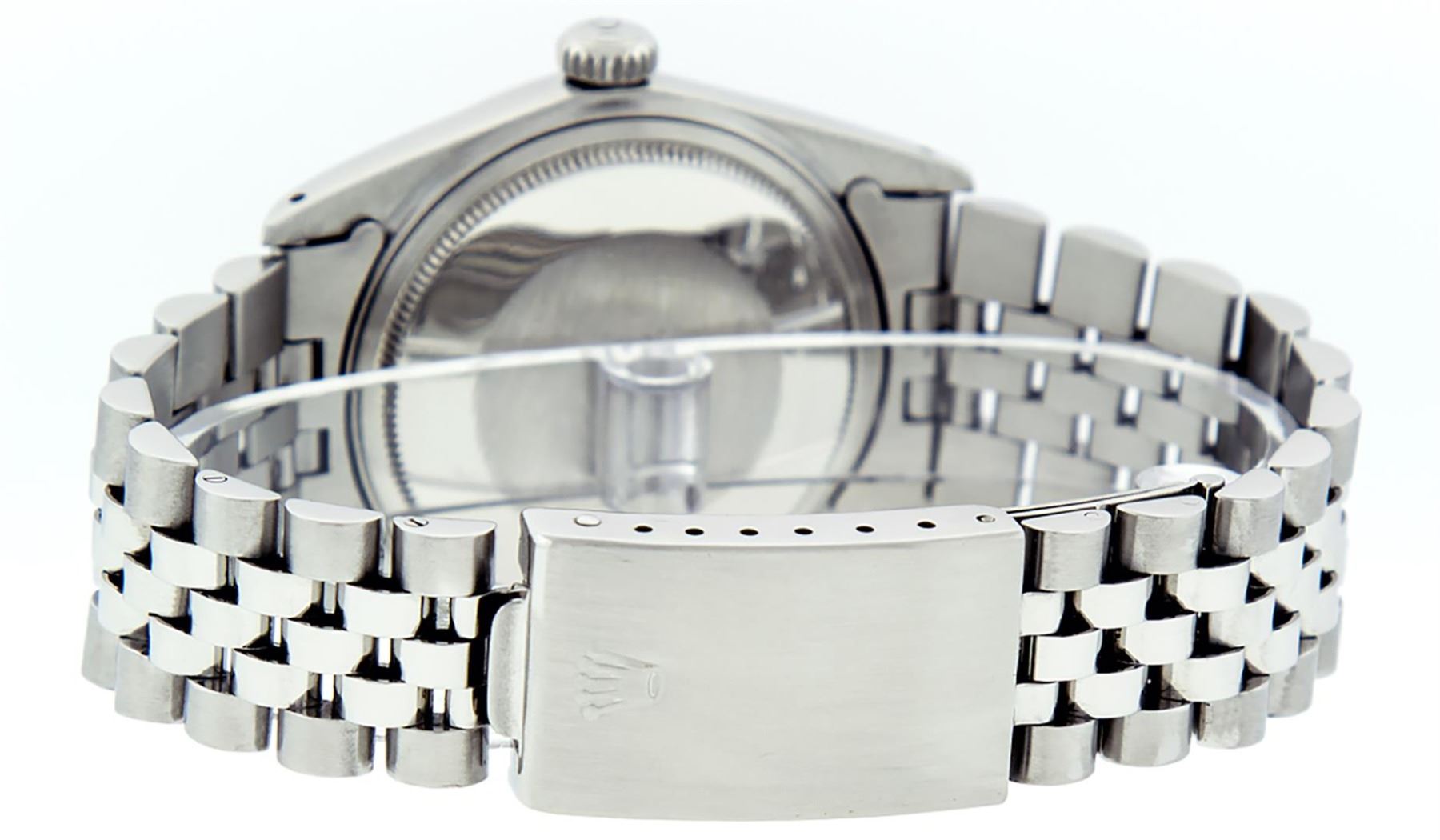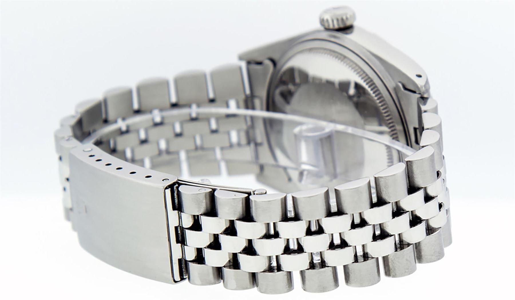 One Pre Owned Stainless Steel Rolex 36MM Datejust Polished, Serviced & Electronically Tested, Rolex Stainless Steel Case: 36mm, Rolex Stainless Steel Crown, Rolex Bezel: White Gold Fluted Bezel. Custom Crystal: New AcrylicWith Magnified Date Window. Custom Hands: New Luminescent Hands. Rolex Movement: Automatic Winding Movement 3035. Custom Dial: Custom Black Dial With Index Hour Markers With Line Track. Date Window: 3 O'Clock Position Date Display, Quickset, Model: Datejust, Condition: G-6 Extra Fine. Rolex Bracelet: Stainless Steel Jubilee Band. Bright Polish & Satin Finish. 7.0 Inch Length, Adjustable. Fold Clasp, With Rolex Logo. Watch Has Been Serviced And Polished It Is Free Of All Scratches And Dents.