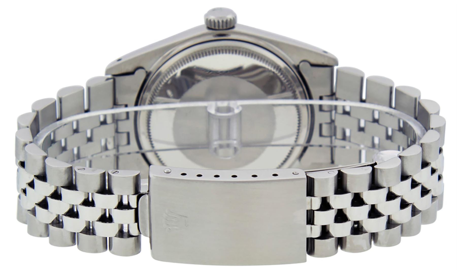 One Pre Owned Stainless Steel Rolex 36MM Datejust Polished Bright with Satin Finish, Serviced & Electronically Tested, Rolex Stainless Steel Case: 36mm, Rolex Stainless Steel Crown, Rolex Bezel: White Gold Fluted Bezel. Custom Crystal: New Plexiglass With Magnified Date Window. Custom Hands: New Hands. Rolex Movement: Automatic Winding Movement 3035. Custom Dial: Custom Black Roman Dial. Date Window: 3 O'Clock Position Date Display, Quickset, Model: Datejust, Condition: G-6 Extra Fine. Rolex Bracelet: Stainless Steel Jubilee Band. Bright Polish & Satin Finish. 7.0 Inch Length, Adjustable. Fold Clasp, With Rolex Logo. This Watch Has Been Serviced And Polished It Is Free Of All Scratches And Dents.