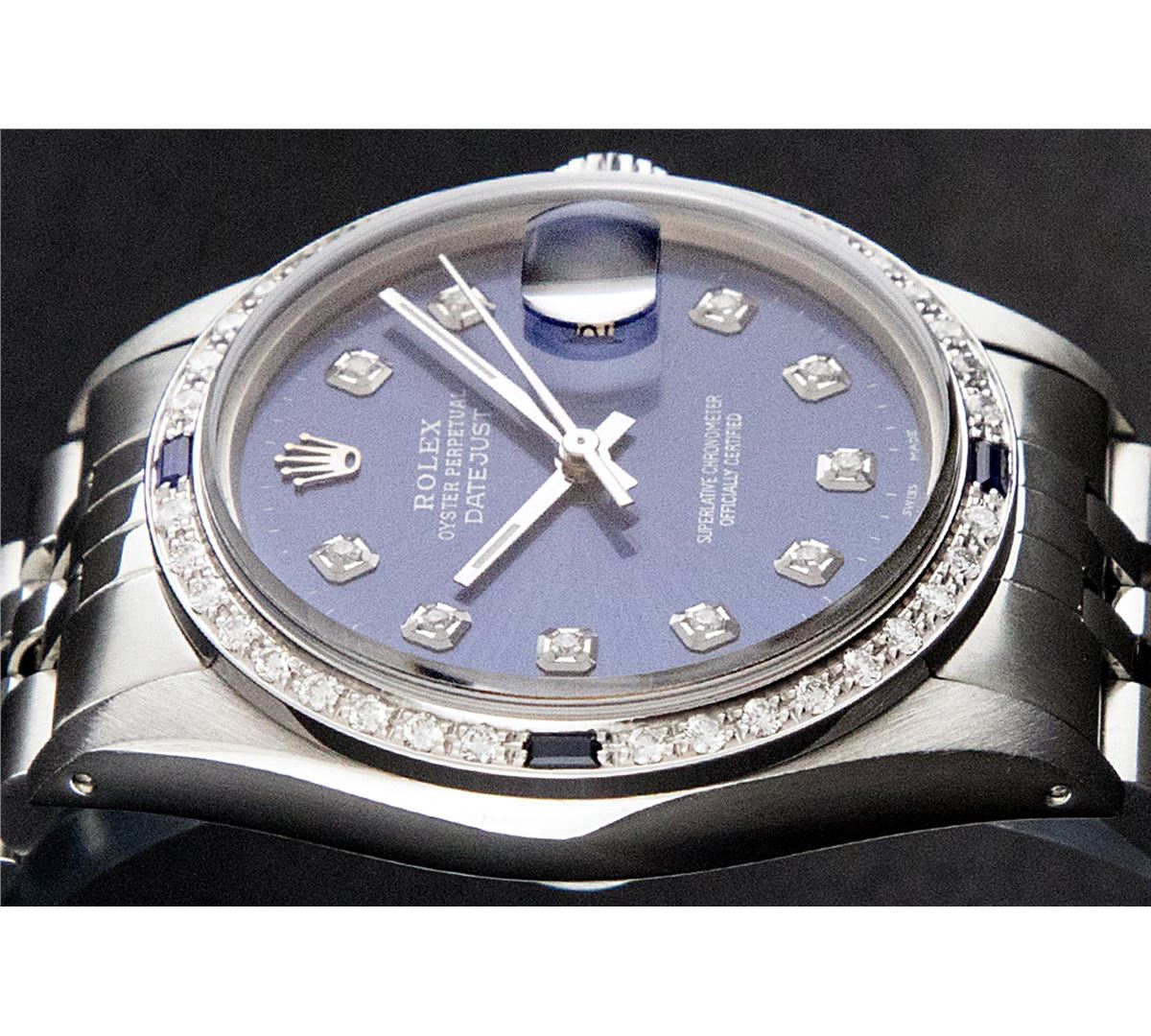 One Gents Rolex Datejust Polished, Serviced & Electronically Tested, Stainless Steel Case:36mm, Stainless Steel Crown, Custom Bezel: 18K White Gold Sapphire Beadset Diamond Bezel, Diamond + Gem Count: 36 Diamonds + 4 Sapphires Total Weight 1.00 Carat, Clarity: SI-VS, Color: G to H. Custom Crystal: Synthetic Sapphire Cyclops Lens. Movement: Automatic Winding Movement Caliber 3035. Custom Dial: Blue Diamond Dial With Small Track, Diamond Count: 10 Diamond Dial G To H In Color, Clarity: SI-VS. Date Window: 3 O'Clock Position Date Display, Quickset, Model: 16014 Condition: G-6 Extra Fine. Bracelet: Stainless Steel Jubilee. Bright Polish & Satin Finish. 7.0 Inch Length, Adjustable. Standard Clasp, With Rolex Logo.