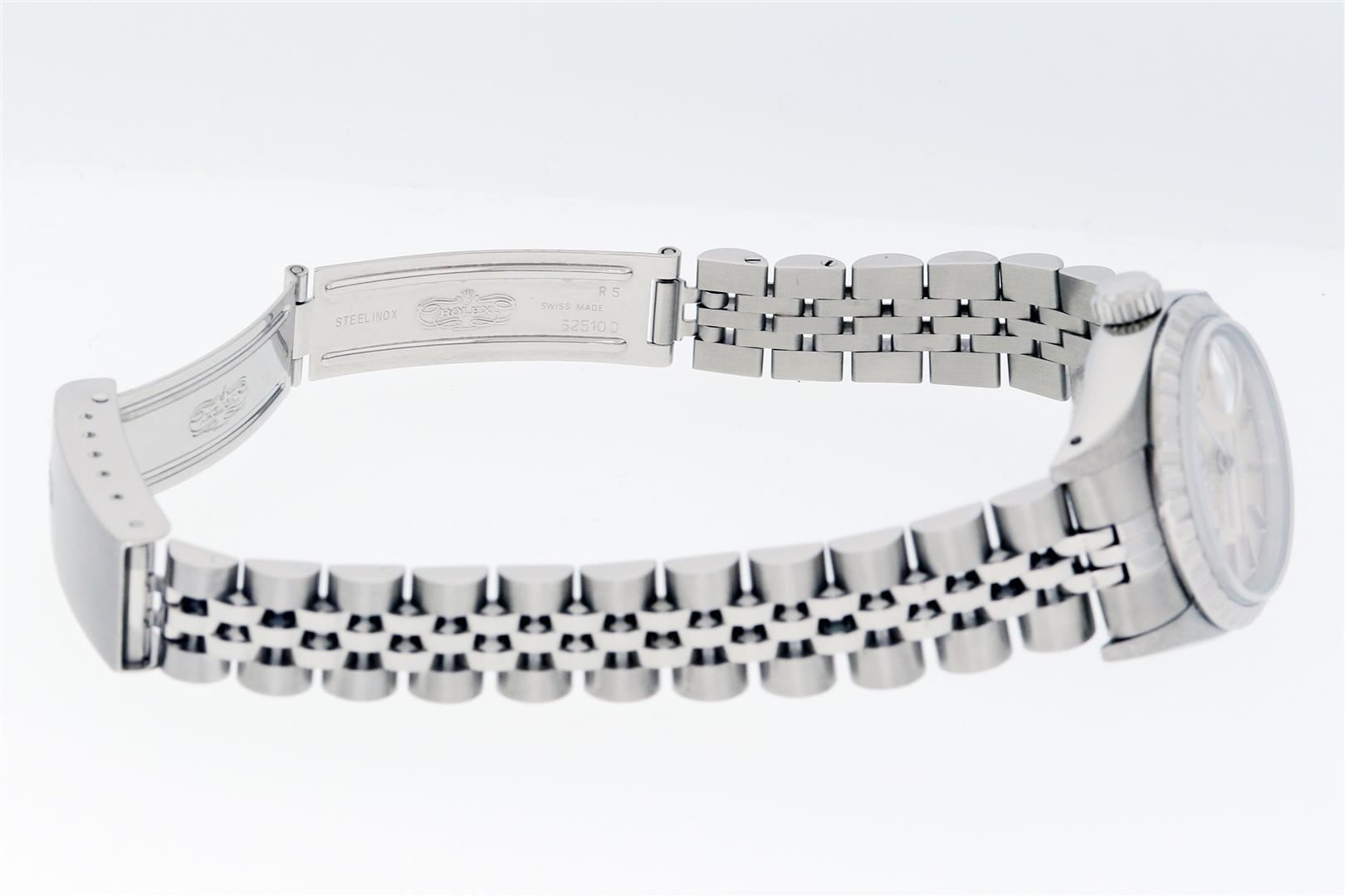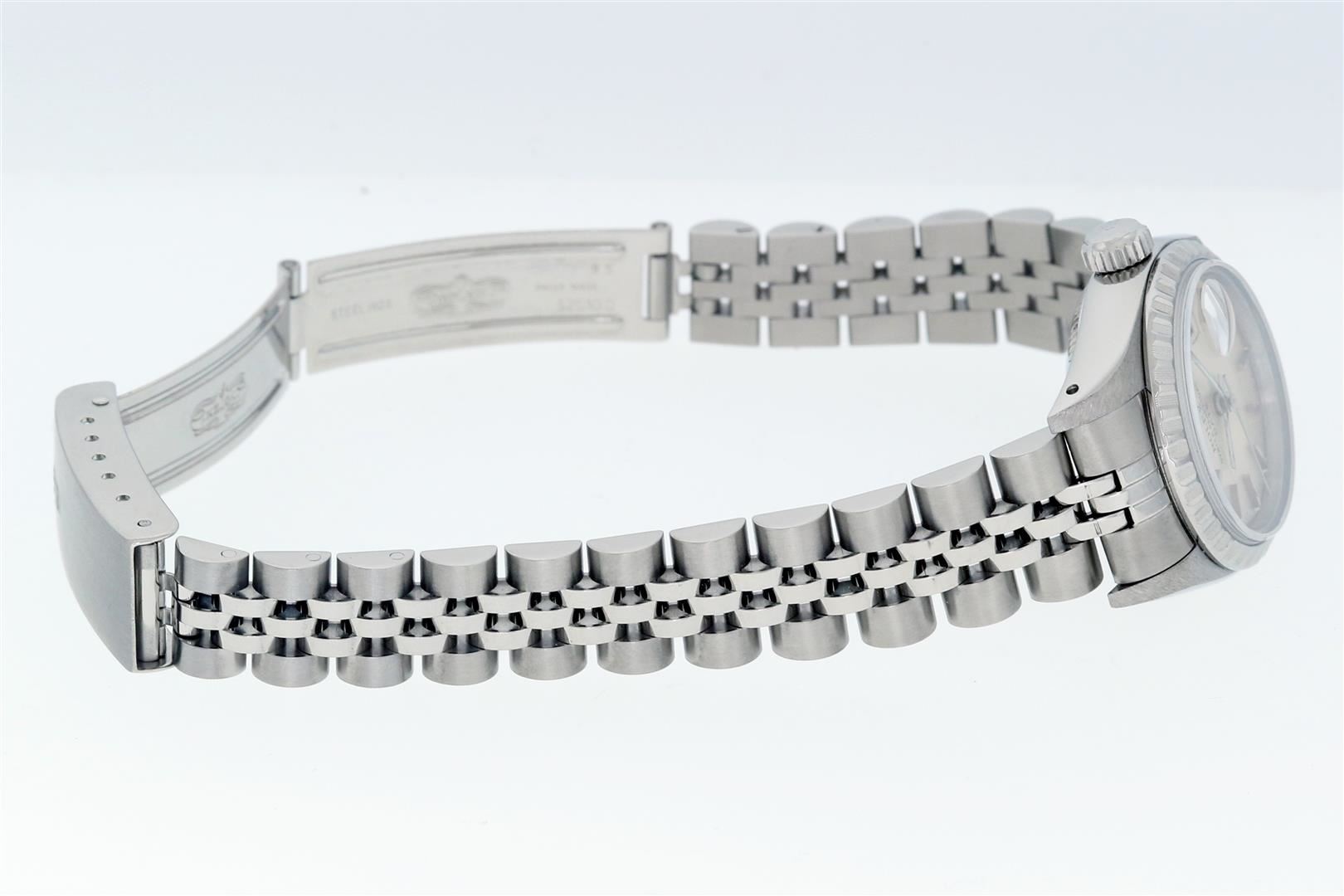 One Ladies Pre Owned Stainless Steel Rolex Datejust Polished Bright with Satin Finish Serviced & Electronically Tested, Rolex Stainless Steel Case: 26mm, Rolex Stainless Steel Crown, Rolex Bezel: Stainless Steel Engine Turn Bezel. Custom Crystal: New Sapphire With Date Window. Custom Hands: New Luminescent Hands. Rolex Movement: Automatic Winding Movement. Rolex Dial: Silver Index Dial With Dash Track And Lumi Dots. Date Window: 3 O'Clock Position Date Display, Model: Datejust. Condition: G-6 Extra Fine. Rolex Bracelet: Stainless Steel Jubilee Band With Rolex Crown On Buckle. Bright Polish & Satin Finish. Band Length: 6.0 Inch Length, Adjustable. Standard Clasp, With Rolex Logo. This Watch Has Been Serviced Time Tested And Is In Excellent Condition It Is Free Of All Scratches And Dents.