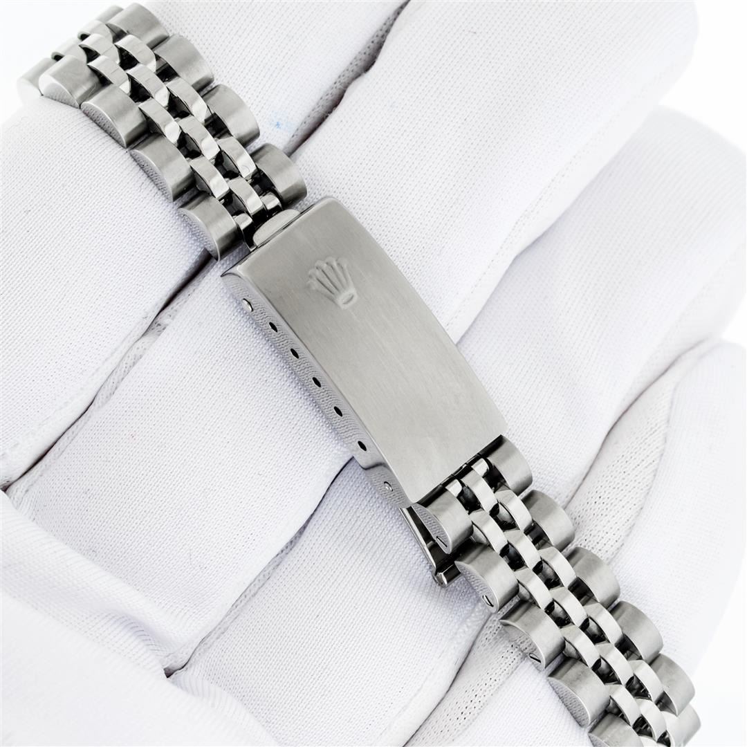 One Ladies Pre Owned Stainless Steel Rolex Date Polished Bright with Satin Finish Serviced & Electronically Tested, Rolex Stainless Steel Case: 26mm, Rolex Stainless Steel Crown, Custom Bezel: New Stainless Steel Beadset Diamond Bezel, Diamond Count: 40 Diamonds On Bezel Dial. Custom Crystal: New Sapphire With Date Window. Custom Hands: New Luminescent Hands. Rolex Movement: Automatic Winding Movement. Rolex Dial: Blue Index Dial With Dash Track And Lumi Dots. Date Window: 3 O'Clock Position Date Display, Model: Datejust. Condition: G-6 Extra Fine. Rolex Bracelet: Stainless Steel Jubilee Band With Rolex Crown On Buckle. Bright Polish & Satin Finish. Band Length: 6.0 Inch Length, Adjustable. Standard Clasp, With Rolex Logo. This Watch Has Been Serviced Time Tested And Is In Excellent Condition It Is Free Of All Scratches And Dents.