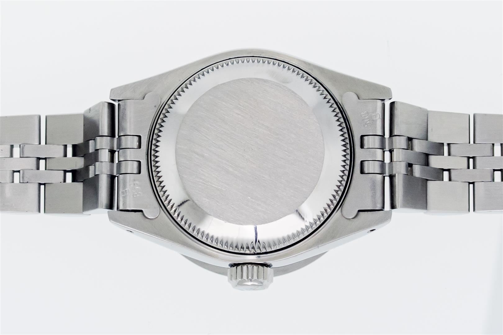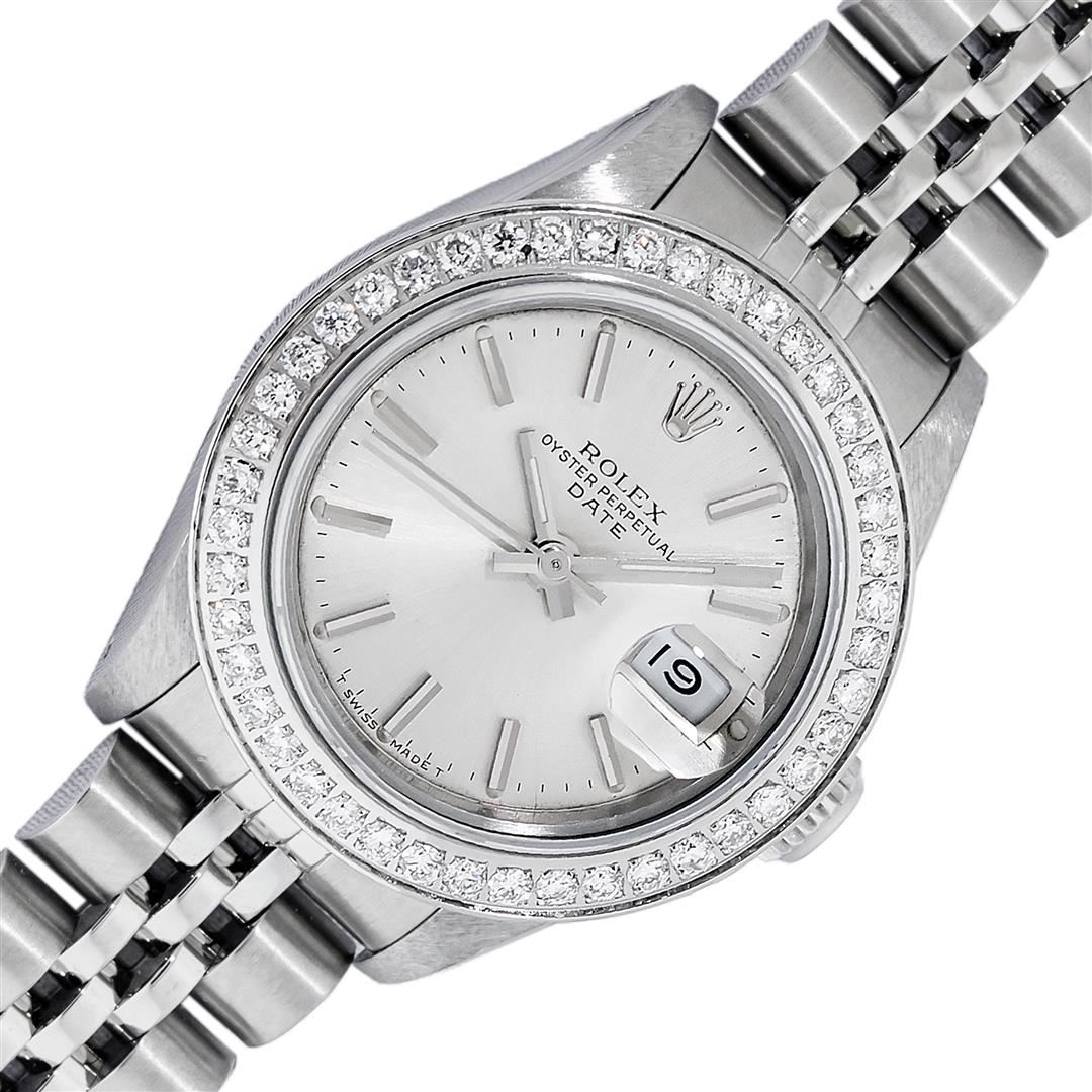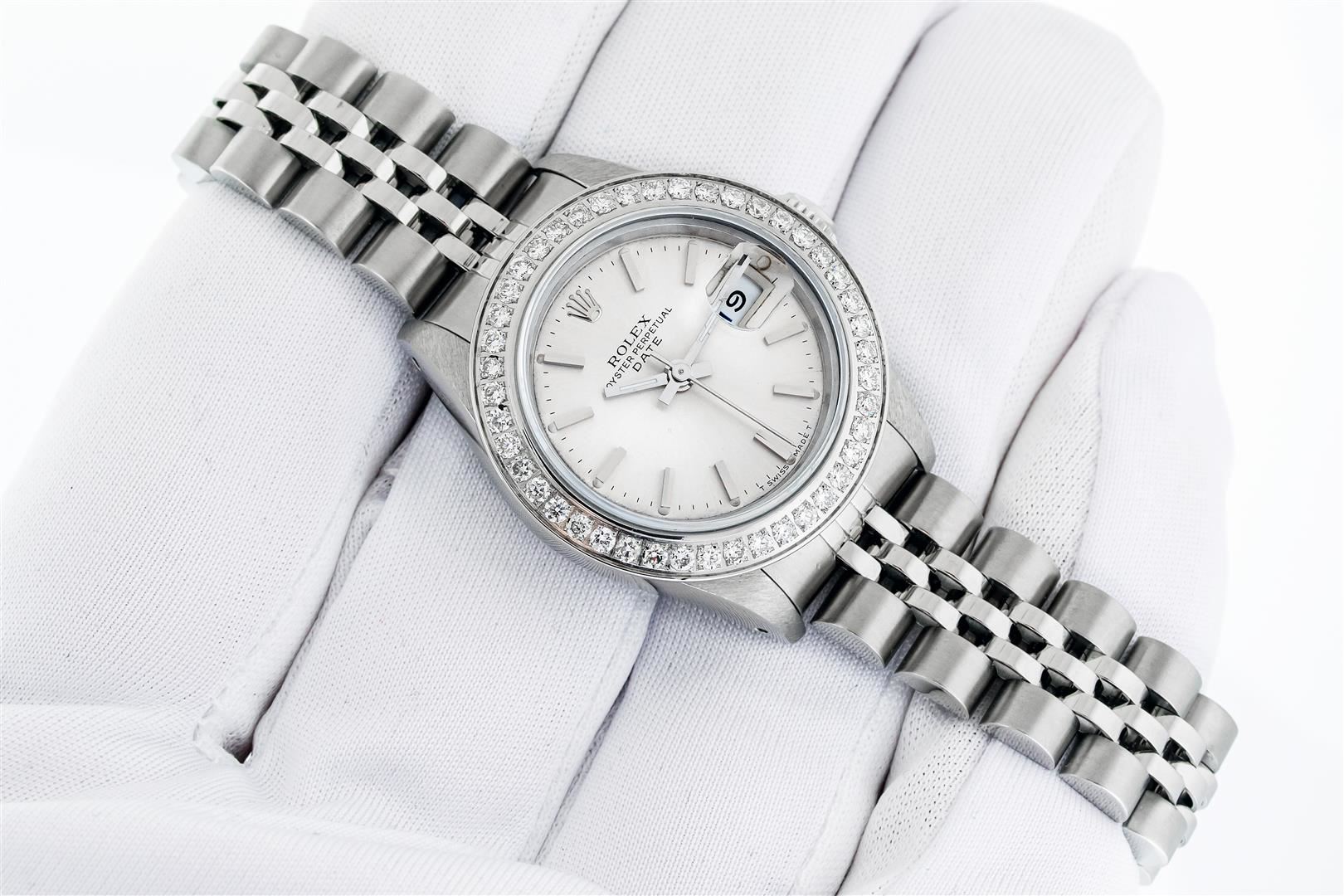 One Ladies Pre Owned Stainless Steel Rolex Date Polished Bright with Satin Finish Serviced & Electronically Tested, Rolex Stainless Steel Case: 26mm, Rolex Stainless Steel Crown, Custom Bezel: New Stainless Steel Beadset Diamond Bezel, Diamond Count: 40 Diamonds On Bezel Dial. Custom Crystal: New Sapphire With Date Window. Custom Hands: New Luminescent Hands. Rolex Movement: Automatic Winding Movement. Rolex Dial: Blue Index Dial With Dash Track And Lumi Dots. Date Window: 3 O'Clock Position Date Display, Model: Datejust. Condition: G-6 Extra Fine. Rolex Bracelet: Stainless Steel Jubilee Band With Rolex Crown On Buckle. Bright Polish & Satin Finish. Band Length: 6.0 Inch Length, Adjustable. Standard Clasp, With Rolex Logo. This Watch Has Been Serviced Time Tested And Is In Excellent Condition It Is Free Of All Scratches And Dents.
