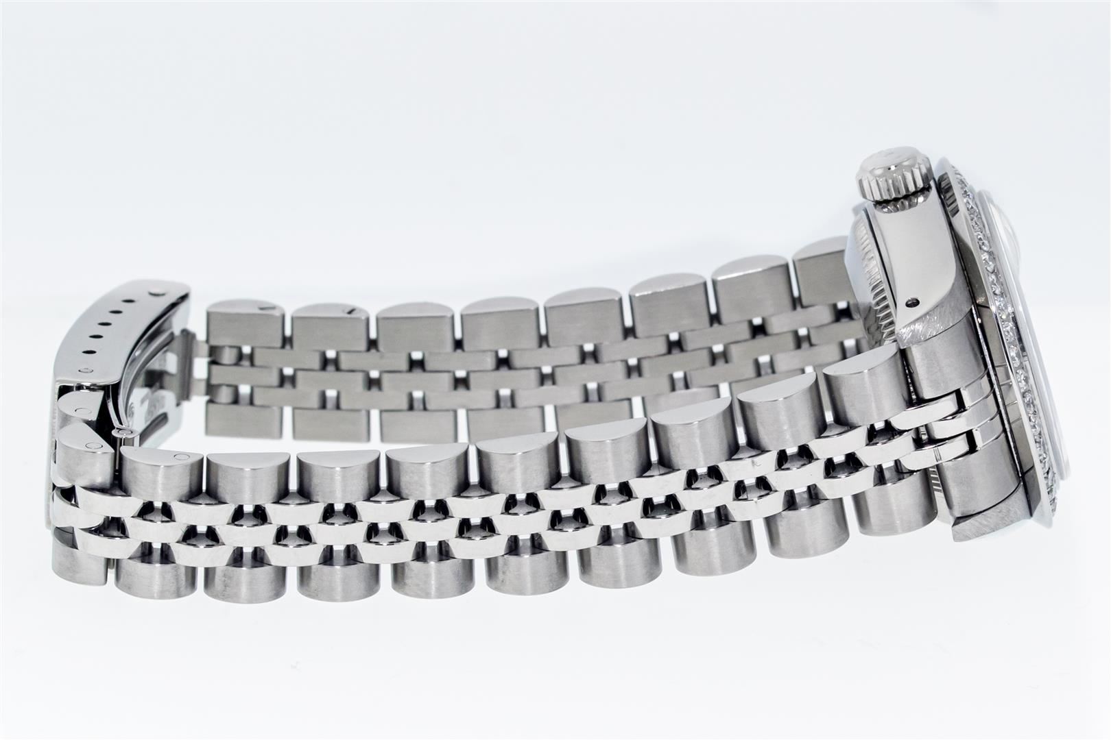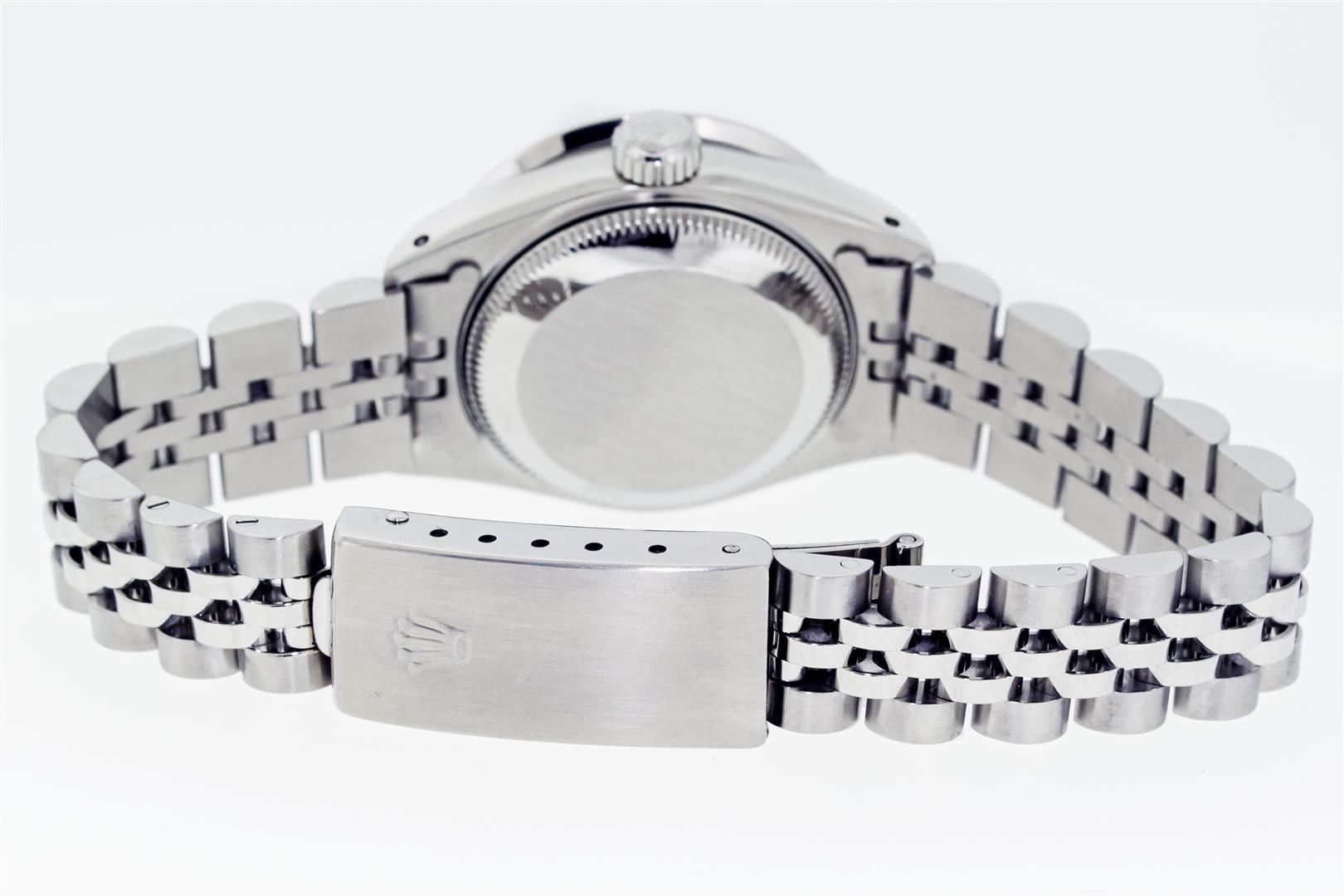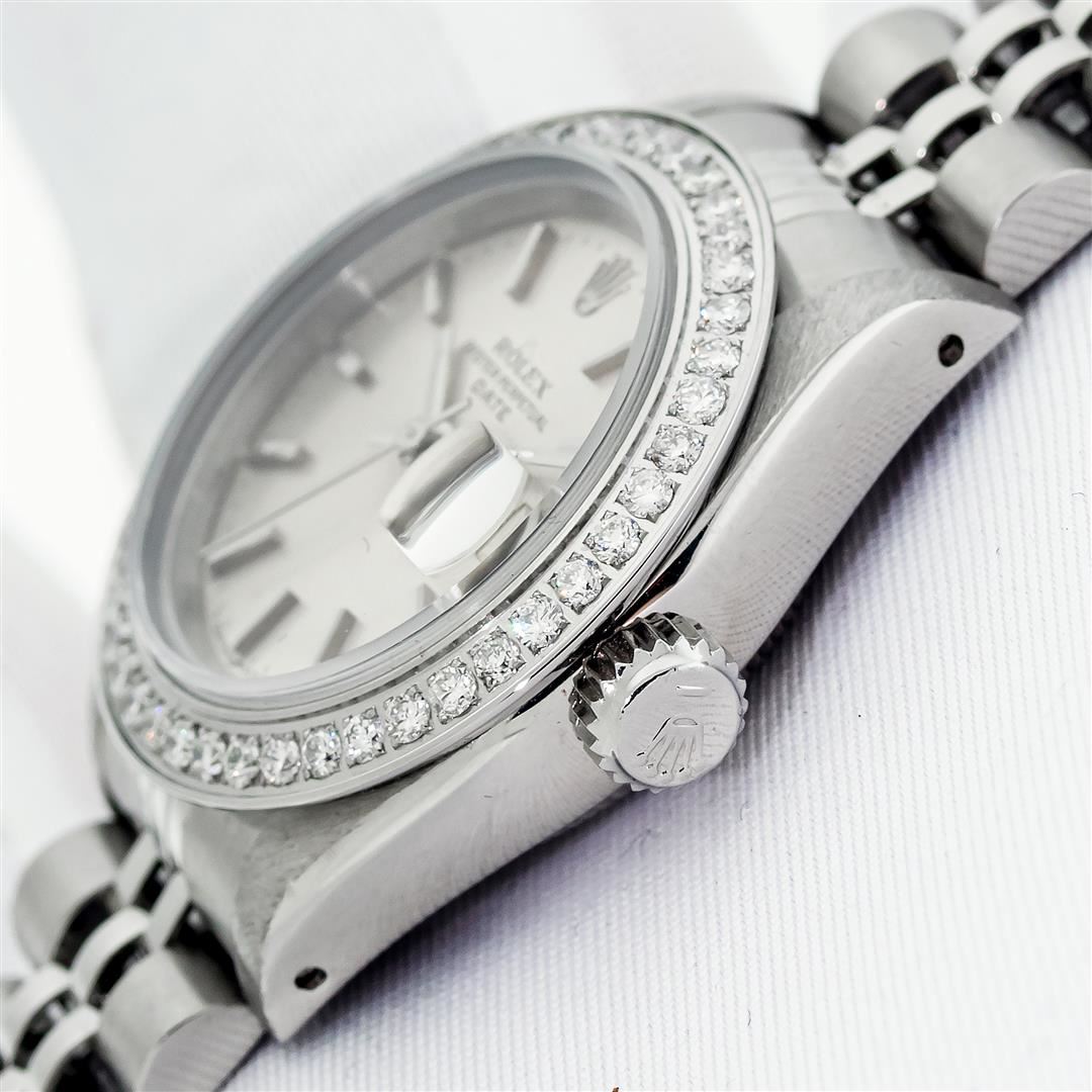 One Ladies Pre Owned Stainless Steel Rolex Date Polished Bright with Satin Finish Serviced & Electronically Tested, Rolex Stainless Steel Case: 26mm, Rolex Stainless Steel Crown, Custom Bezel: New Stainless Steel Beadset Diamond Bezel, Diamond Count: 40 Diamonds On Bezel Dial. Custom Crystal: New Sapphire With Date Window. Custom Hands: New Luminescent Hands. Rolex Movement: Automatic Winding Movement. Rolex Dial: Blue Index Dial With Dash Track And Lumi Dots. Date Window: 3 O'Clock Position Date Display, Model: Datejust. Condition: G-6 Extra Fine. Rolex Bracelet: Stainless Steel Jubilee Band With Rolex Crown On Buckle. Bright Polish & Satin Finish. Band Length: 6.0 Inch Length, Adjustable. Standard Clasp, With Rolex Logo. This Watch Has Been Serviced Time Tested And Is In Excellent Condition It Is Free Of All Scratches And Dents.