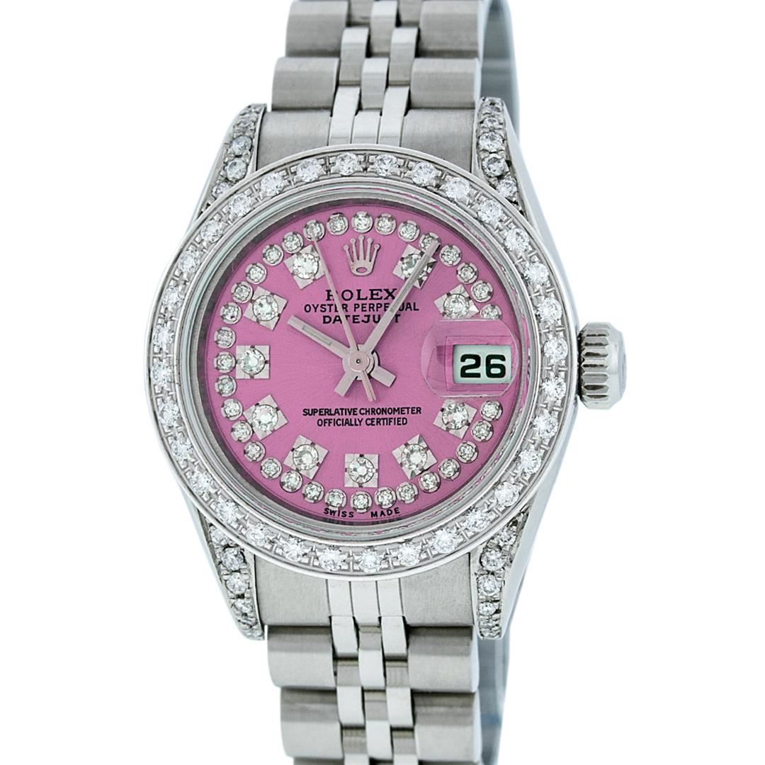 One Ladies Rolex Datejust Polished Bright with Satin Finish, Serviced & Electronically Tested, Stainless Steel Case:26mm, Stainless Steel Crown, Diamond Lugs: 16 Diamonds On Lugs, Clarity: SI-VS, Color: G to H. Custom Bezel: 18K White Gold Beadset Bezel, Diamond Count: 32 Diamonds, Total Weight 1.00 Carat, Clarity: SI-VS, Color: G to H. Custom Crystal: Synthetic Sapphire Cyclops Lens. Movement: Automatic Winding Movement Caliber 2235. Custom Dial: Refinished Pink With String Diamond Dial VVS, 43 Diamonds in Dial G To H In Color, Clarity: VVS. Date Window: 3 O'clock Position Date Display, Model: No Hole Quickset Datejust. Condition: G-6 Extra Fine. Bracelet: Stainless Steel Jubilee Band. Bright Polish & Satin Finish. 6.0 Inch Length, Adjustable. Standard Clasp, With Rolex Logo. Comes with 6 month warranty.