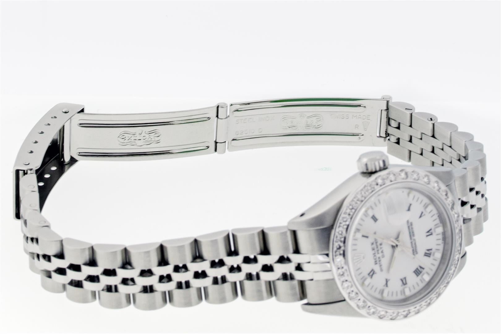 One Ladies Pre Owned Stainless Steel Rolex Datejust Polished Bright with Satin Finish, Serviced & Electronically Tested, Stainless Steel Case: 26mm, Stainless Steel Crown, Custom Bezel: New 18K White Gold Beadset Diamond Bezel, Diamond Count: 32 Diamonds, Total Weight .70 Carat, Clarity: SI-VS, Color: G to H. Custom Crystal: New Sapphire With Magnified Date Window. Custom Hands: New Luminescent Hands. Rolex Movement: Automatic Winding Movement. Rolex Dial: Factory White Roman Dial With Index Hour Markers And Lumi Dots. Date Window: 3 O'Clock Position Date Display, Model: Datejust. Condition: G-6 Extra Fine. Rolex Bracelet: Stainless Steel Jubilee Band. Bright Polish & Satin Finish. 6.0 Inch Length, Adjustable. Standard Clasp, With Rolex Logo. This Watch Has Been Serviced Time Tested And Is In Excellent Condition It Is Free Of All Scratches And Dents. This Watch Comes With A Rolex Box, 2 Booklets, And A Red Leather Wallet.