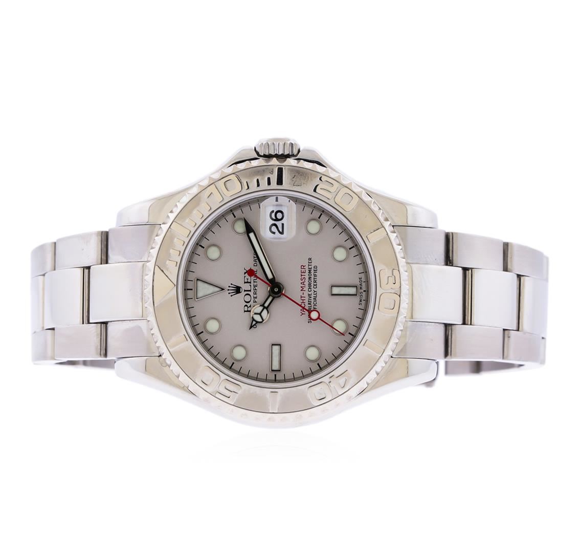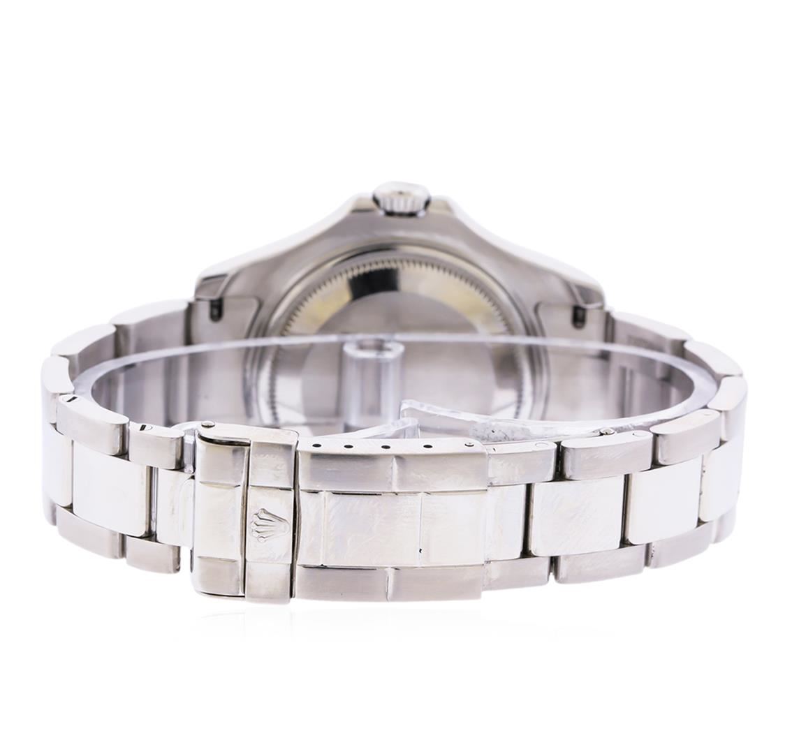 One, hand crafted & machine milled Rolex stainless steel Yacht-Master wristwatch electronically tested, Case: 35mm oyster, Crown: twinlock with logo, set within protective shoulders, Platinum Bezel: bi- directional sixty minute time lapse function, with high relief indices and numerals, Rolex Hallmarked Crystal: synthetic sapphire cyclops lens. Movement: superlative chronometer, Rolex signed Dial: Platinum color, with Blue luminous hands and indices, Circa: 2002, Date Window: 3 o'clock position quick set, Rolex Bracelet: Stainless Steel oyster links, Bright polish and brushed finish, Condition: G-6 Extra Fine. Seven inch length, adjustable. Four removable links. Total Weight of Watch 100.46gm. AIG Appraised at $8,450.00.