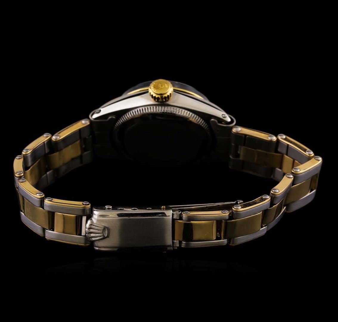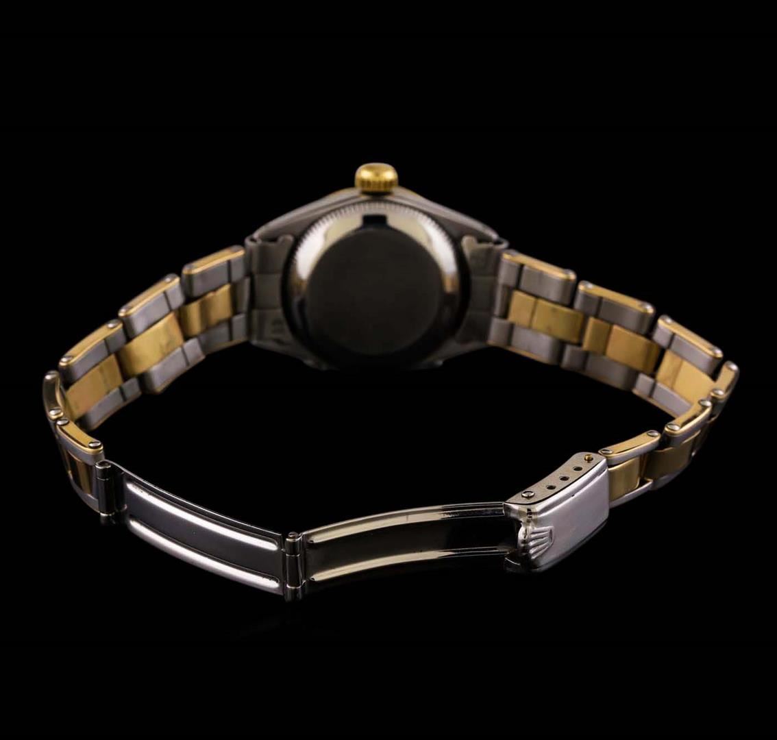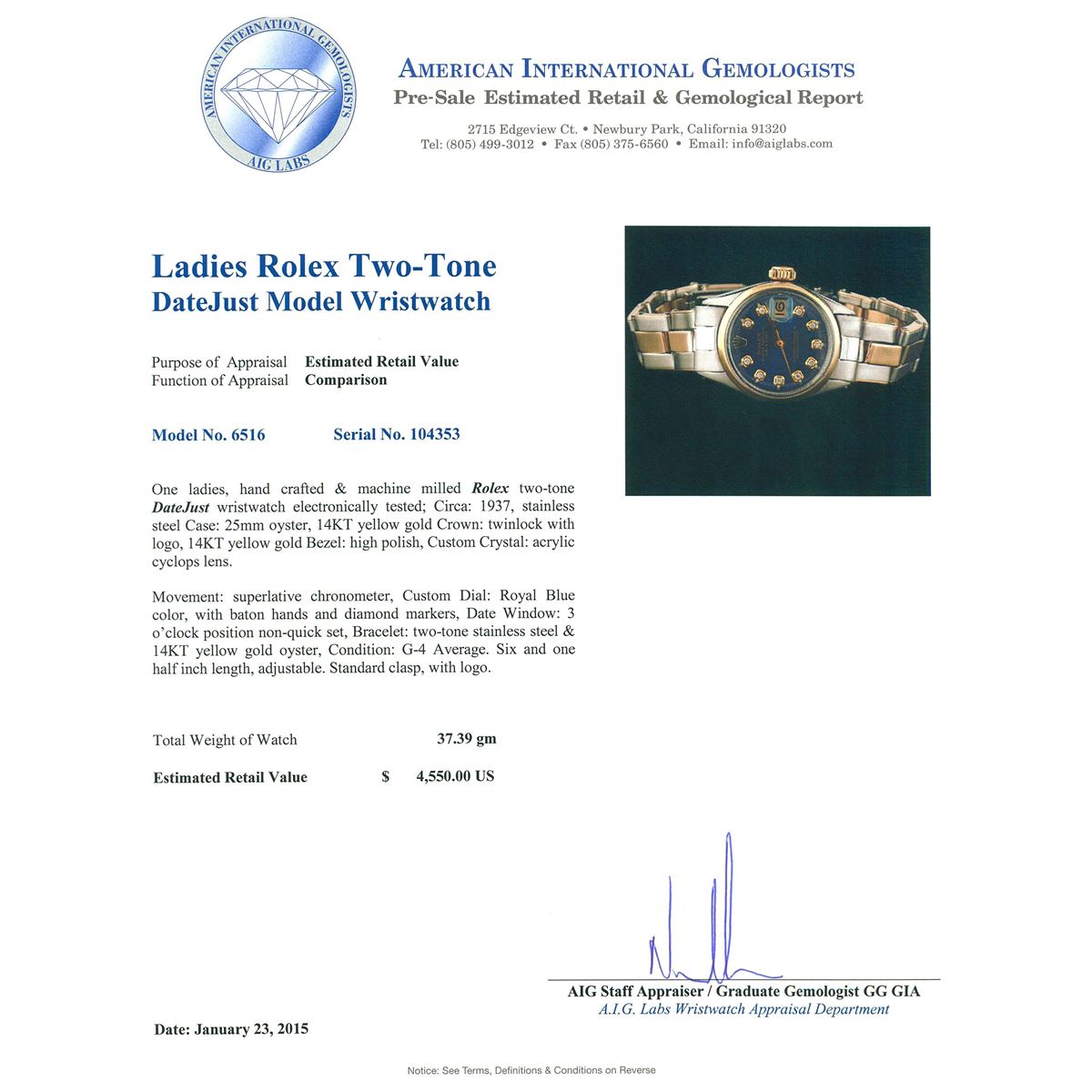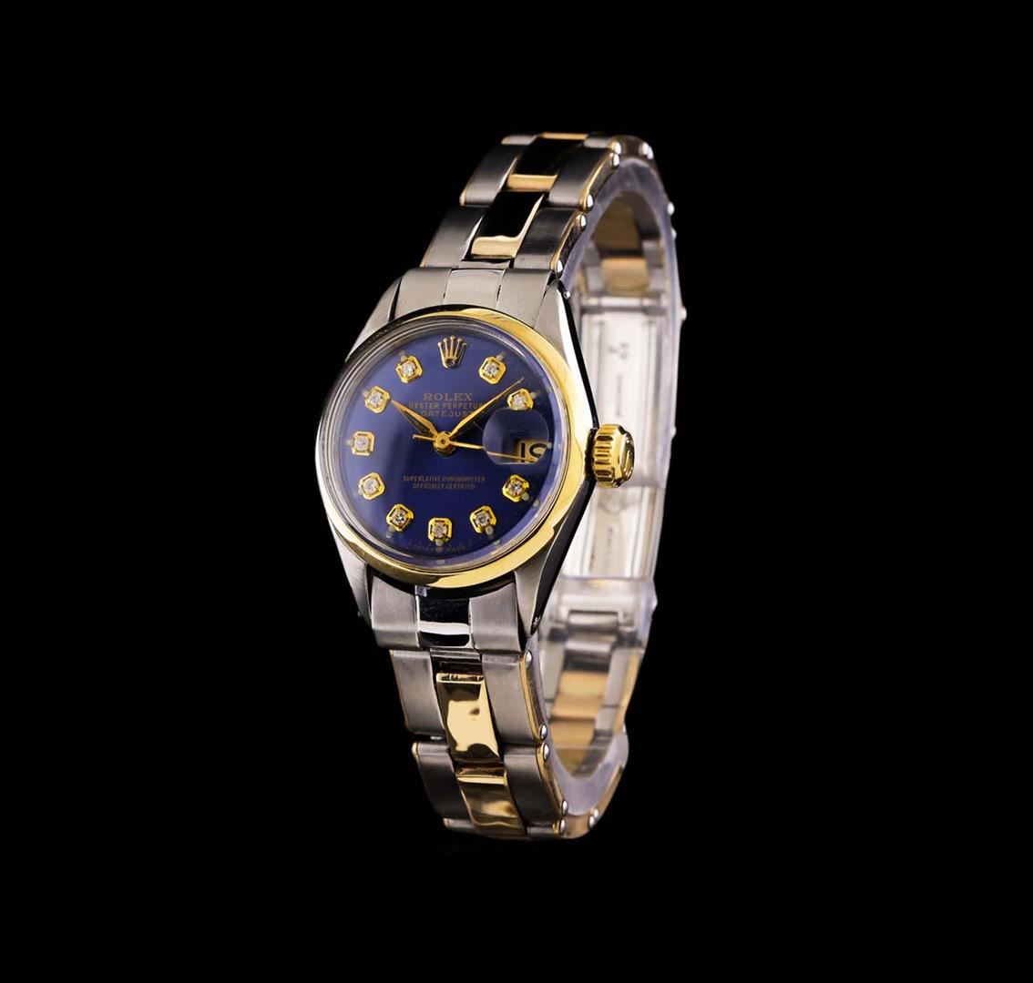 One ladies, hand crafted & machine milled Rolex two-tone DateJust wristwatch electronically tested; Circa: 1937, stainless steel Case: 25mm oyster, 14KT yellow gold Crown: twinlock with logo, 14KT yellow gold Bezel: high polish, Custom Crystal: acrylic cyclops lens. Movement: superlative chronometer, Custom Dial: Royal Blue color, with baton hands and diamond markers, Date Window: 3 o'clock position non-quick set, Bracelet: two-tone stainless steel & 14KT yellow gold oyster, Condition: G-4 Average. Six and one half inch length, adjustable. Standard clasp, with logo. Total Weight of Watch 37.39 grams. AIG Appraised at $4,550.00.