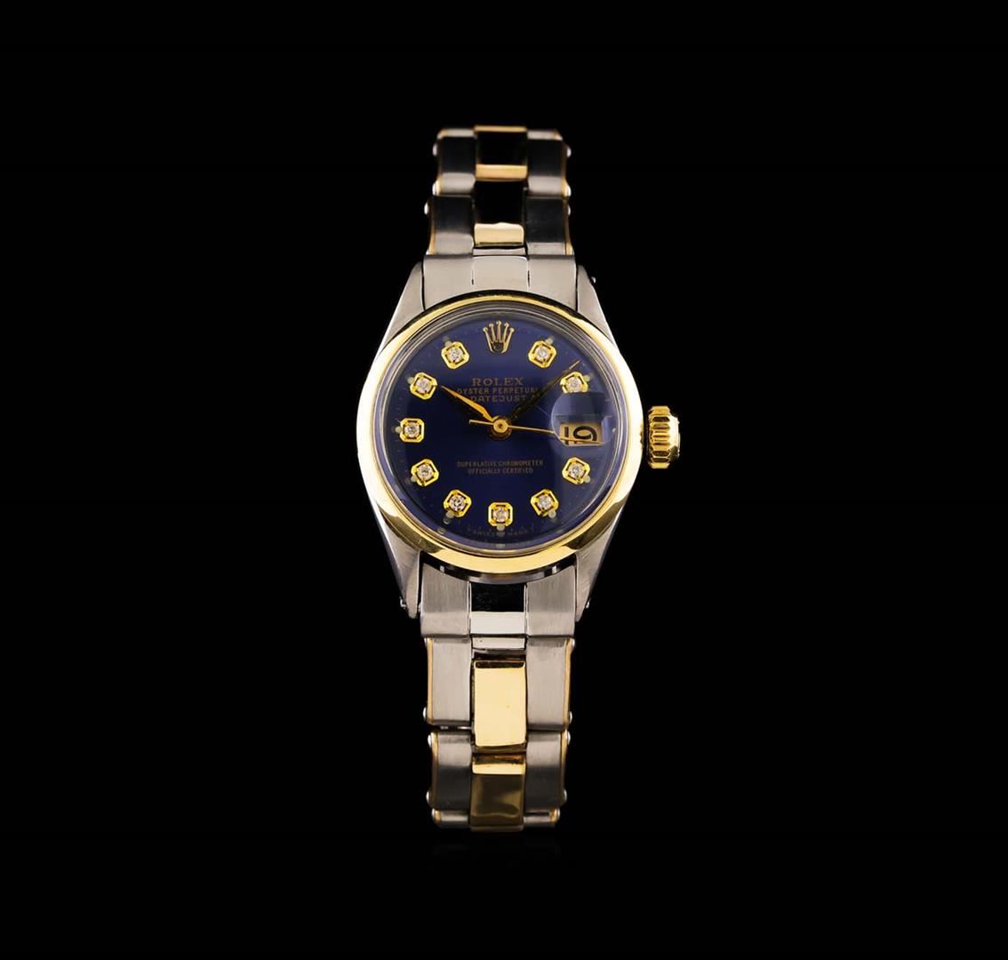 One ladies, hand crafted & machine milled Rolex two-tone DateJust wristwatch electronically tested; Circa: 1937, stainless steel Case: 25mm oyster, 14KT yellow gold Crown: twinlock with logo, 14KT yellow gold Bezel: high polish, Custom Crystal: acrylic cyclops lens. Movement: superlative chronometer, Custom Dial: Royal Blue color, with baton hands and diamond markers, Date Window: 3 o'clock position non-quick set, Bracelet: two-tone stainless steel & 14KT yellow gold oyster, Condition: G-4 Average. Six and one half inch length, adjustable. Standard clasp, with logo. Total Weight of Watch 37.39 grams. AIG Appraised at $4,550.00.