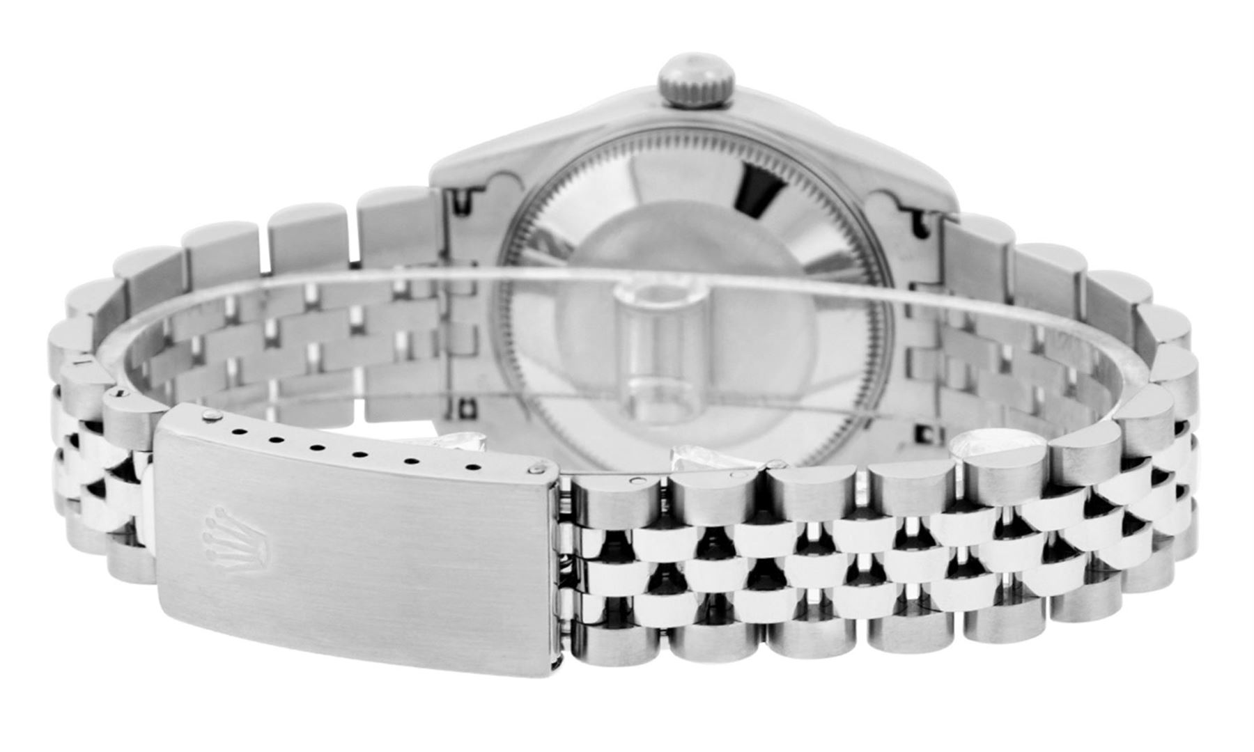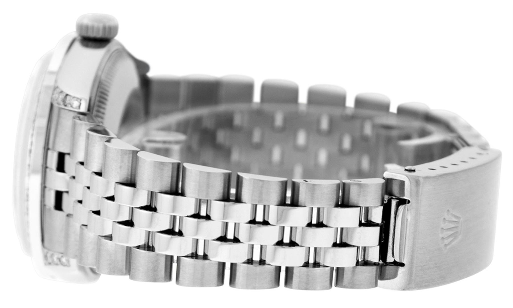 One Womens Midsize Stainless Steel Rolex Datejust Polished, Serviced & Electronically Tested, Stainless Steel Case Case: 31mm, Stainless Steel Crown, Custom Diamond Lugs: 24 Diamonds On Lugs; Color: G To H, Clarity: SI-VS. Custom Bezel: New 18K White Gold Emerald Beadset Diamond Bezel, Diamond Count: 40 Diamonds + 4 Emeralds, Color: G To H, Clarity: VS2-SI1. Custom Crystal: New Scratch Resistant Synthetic Sapphire Cyclops Lens. Custom Hands: New Luminecent Hands. Movement: Automatic Winding Movement Caliber 2135. Custom Dial: Green Diamond Dial. Diamond Count: 10 Single Cut Diamonds On Dial; Color: G to H, Clarity: VS2-SI1, Date Window: 3 O'Clock Position Date Display, Quickset, Model: Midsize Datejust. Condition: G-6 Extra Fine. Bracelet: Stainless Steel Jubilee Band. Bright Polish. 6.0 Inch Length, Adjustable. Standard Clasp, With Rolex Logo. This Watch Has Been Serviced Time Tested And Is In Excellent Condition It Is Free Of All Scratches And Dents.
