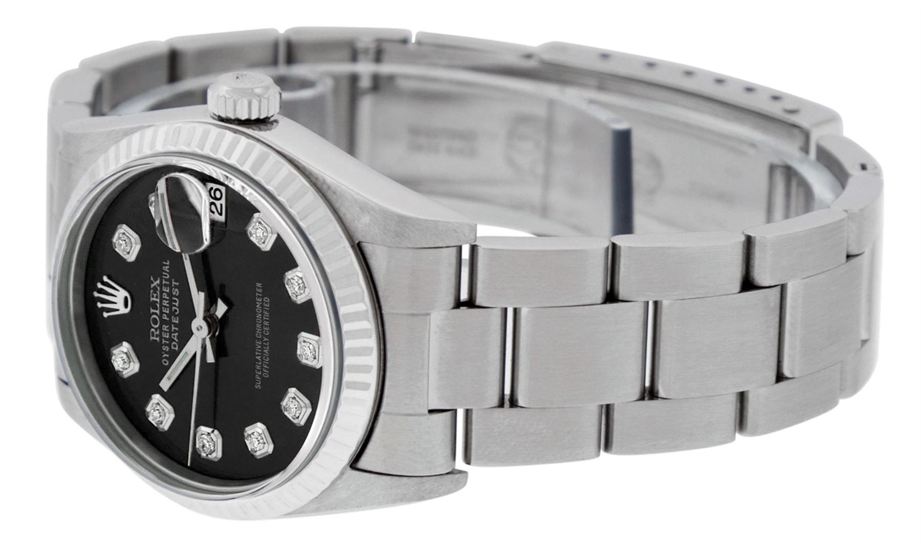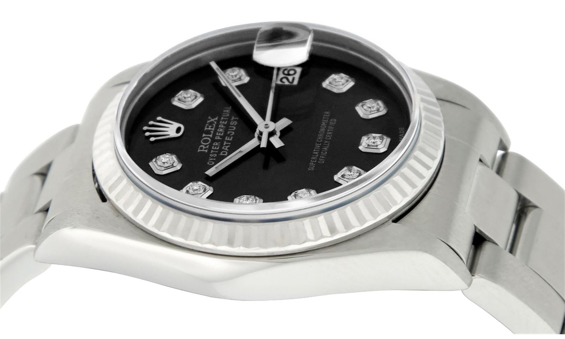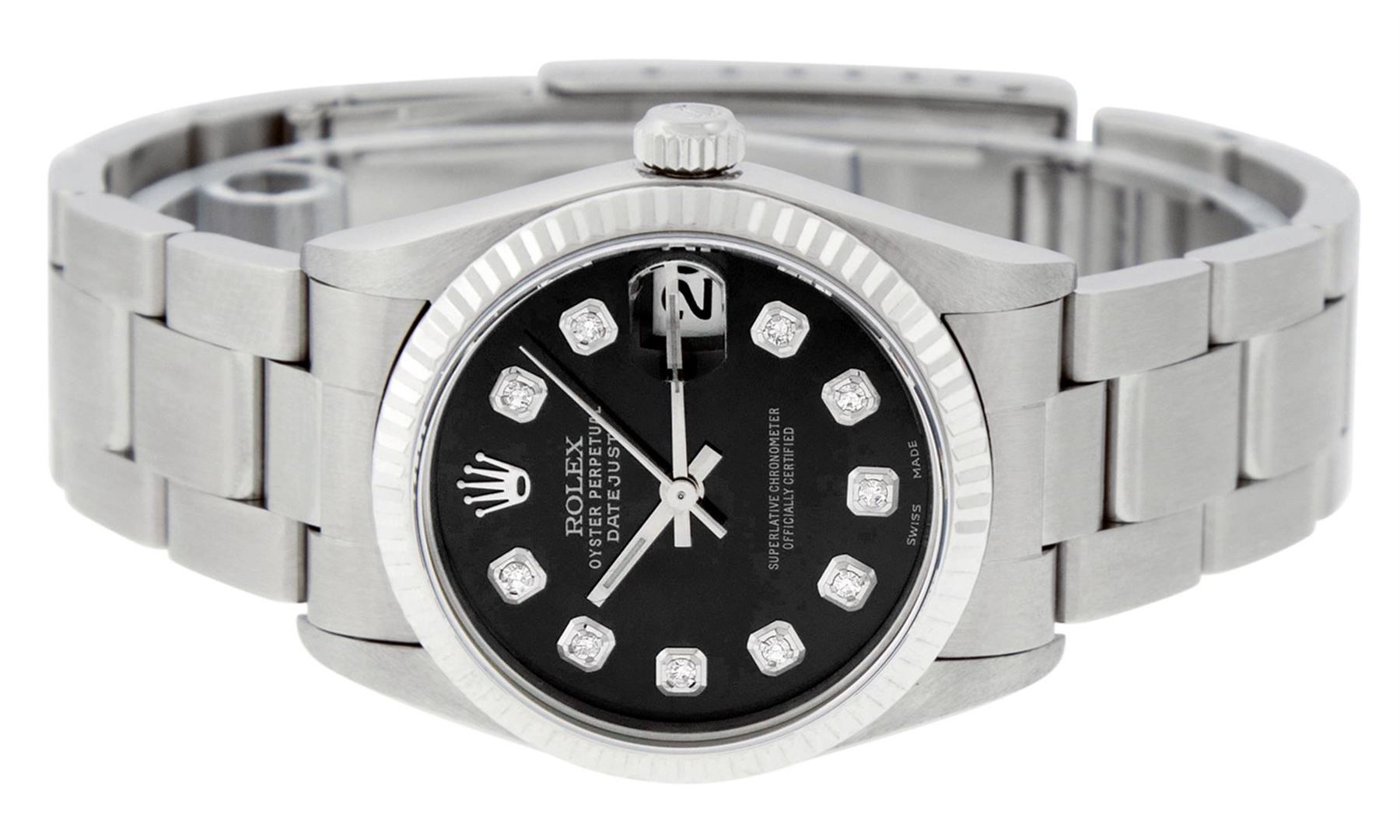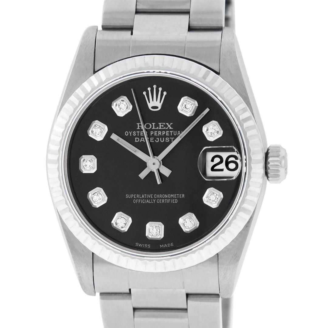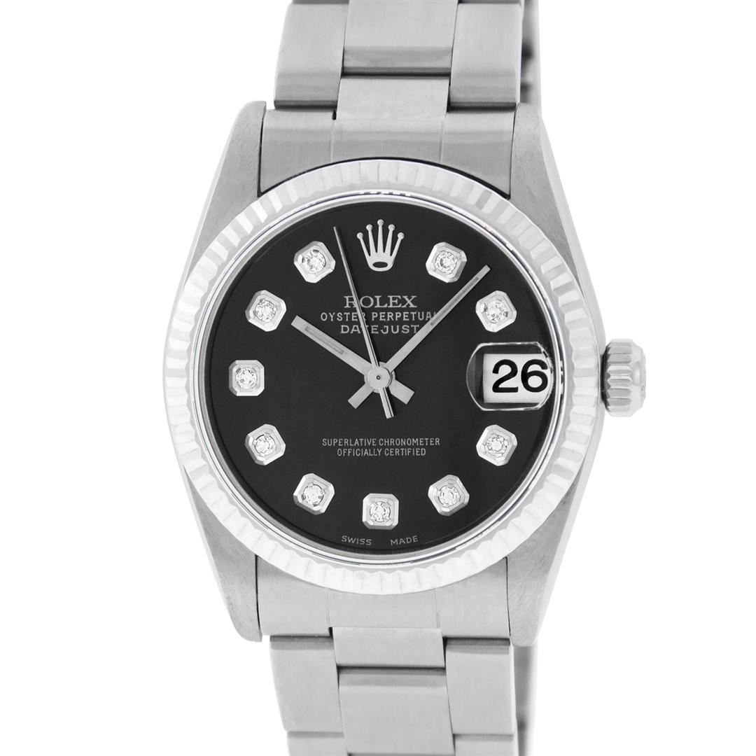 One Womens Midsize Stainless Steel Rolex Datejust Polished, Serviced & Electronically Tested, Stainless Steel Case Case: 31mm, Stainless Steel Crown, Bezel: White Gold Fluted Bezel, Custom Crystal: New Scratch Resistant Synthetic Sapphire Cyclops Lens. Custom Hands: New Lumi Hands. Movement: Automatic Winding Movement Caliber 2235. Custom Dial: Refinished Black Diamond Dial, Diamond Count: 10 Single Cut Diamonds On Dial, Date Window: 3 O'Clock Position Date Display, Quickset, Model: Midsize Datejust. Condition: G-6 Extra Fine. Bracelet: Stainless Steel Oyster Band. Bright Polish. 6.0 Inch Length, Adjustable. Standard Clasp, With Rolex Logo. This Watch Has Been Serviced Time Tested And Is In Excellent Condition It Is Free Of All Scratches And Dents. This Is The Larger Version Of The Ladies Watch.