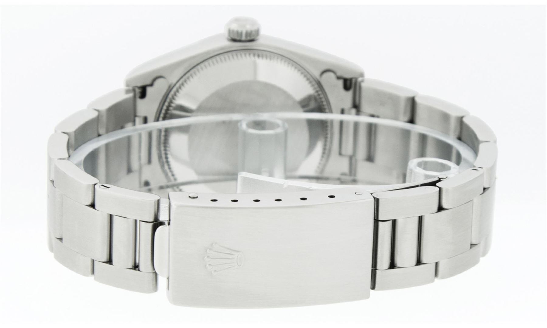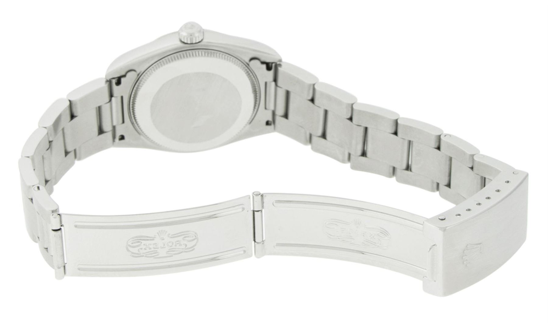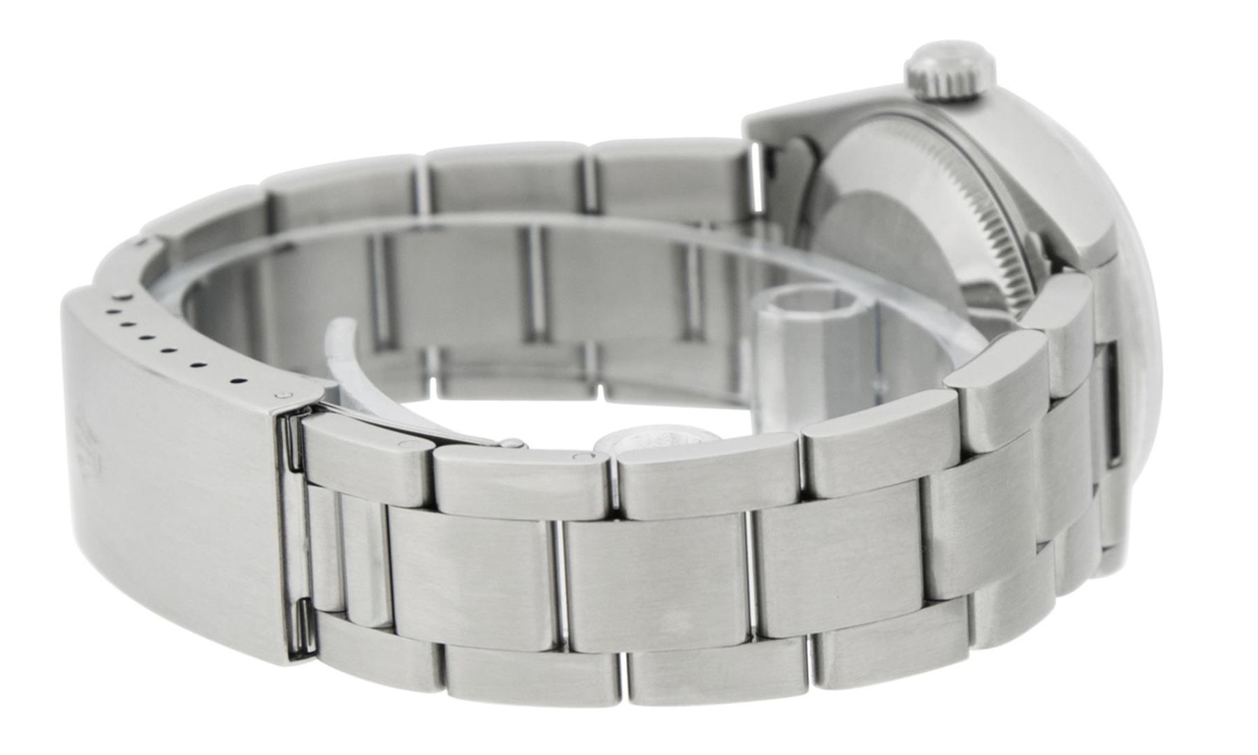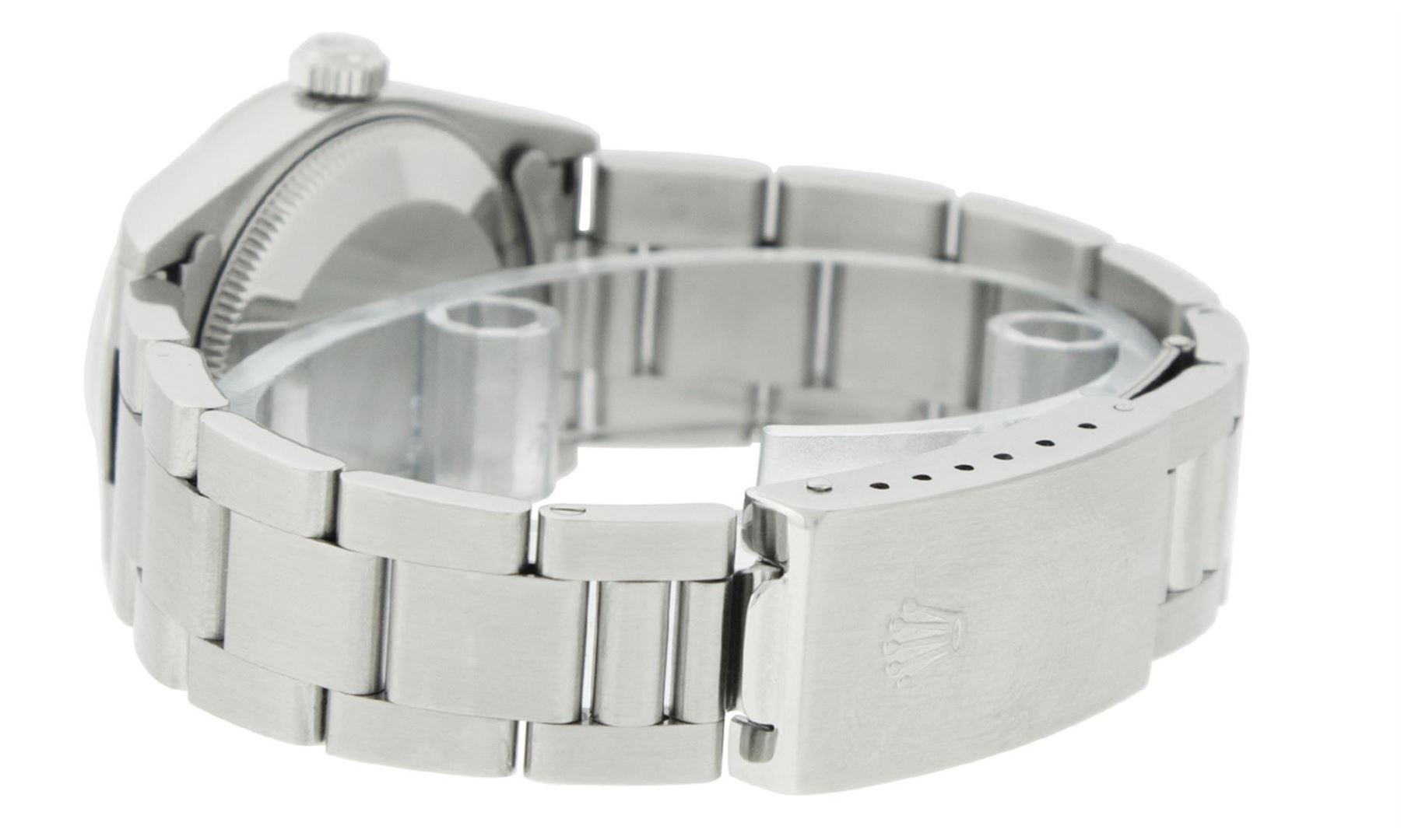 One Womens Midsize Stainless Steel Rolex Datejust Polished, Serviced & Electronically Tested, Stainless Steel Case Case: 31mm, Stainless Steel Crown, Bezel: White Gold Fluted Bezel, Custom Crystal: New Scratch Resistant Synthetic Sapphire Cyclops Lens. Custom Hands: New Lumi Hands. Movement: Automatic Winding Movement Caliber 2235. Custom Dial: Refinished Black Diamond Dial, Diamond Count: 10 Single Cut Diamonds On Dial, Date Window: 3 O'Clock Position Date Display, Quickset, Model: Midsize Datejust. Condition: G-6 Extra Fine. Bracelet: Stainless Steel Oyster Band. Bright Polish. 6.0 Inch Length, Adjustable. Standard Clasp, With Rolex Logo. This Watch Has Been Serviced Time Tested And Is In Excellent Condition It Is Free Of All Scratches And Dents. This Is The Larger Version Of The Ladies Watch.