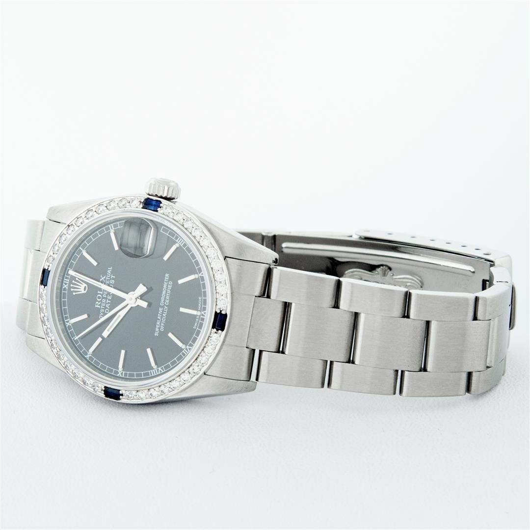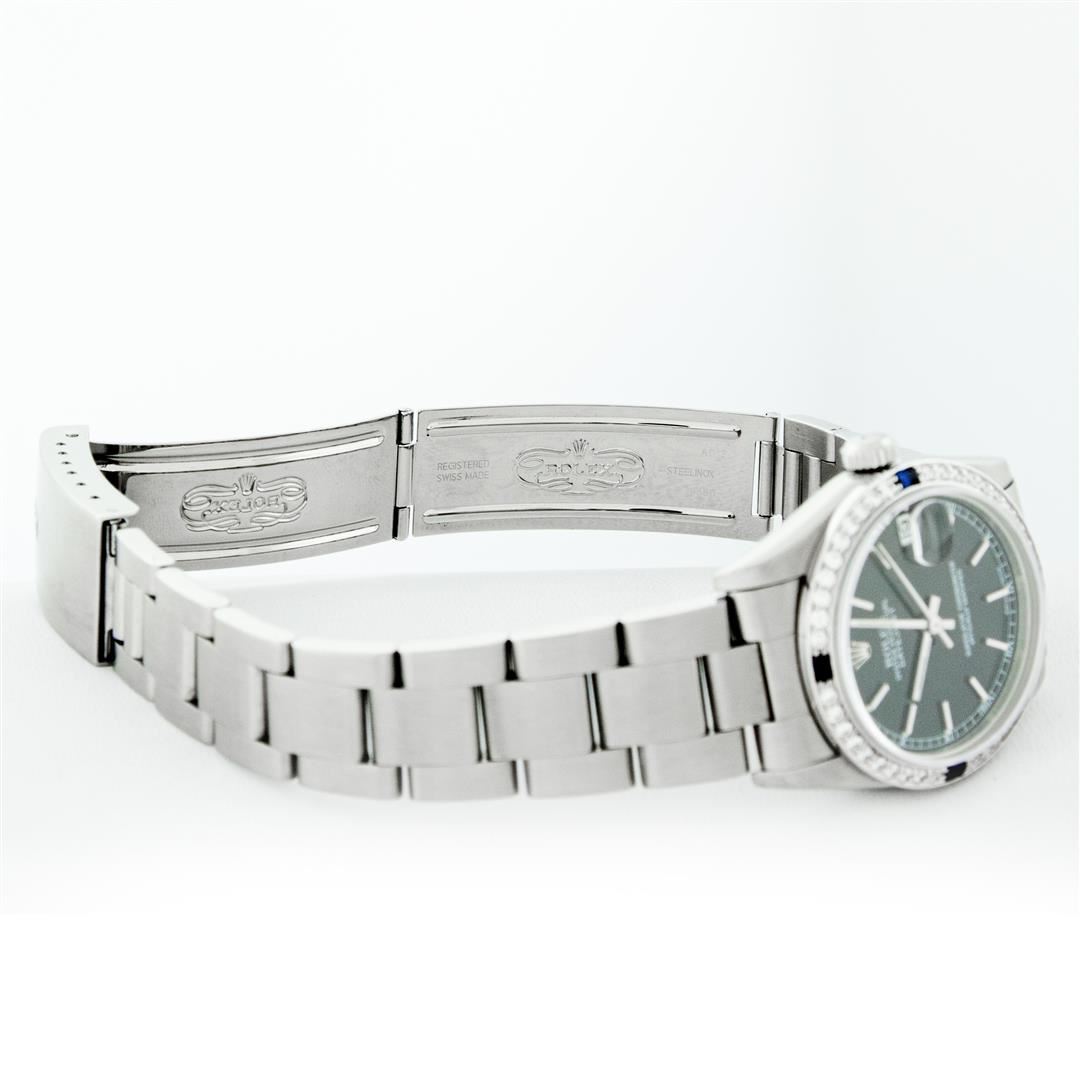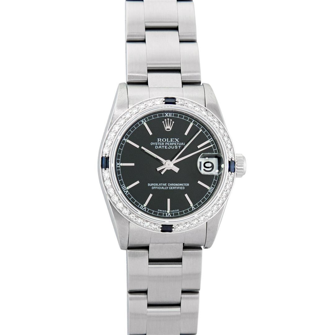 One Women's Pre Owned Midsize Stainless Steel Rolex Datejust Polished, Serviced & Electronically Tested, Rolex Stainless Steel Case Case: 31mm, Rolex Stainless Steel Crown, Custom Bezel: New 18K White Gold Sapphire Beadset Diamond Bezel, Diamond Count: 40 Diamonds + 4 Sapphires On Bezel, Color: G To H, Clarity: VS2-SI1. Custom Crystal: New Scratch Resistant Synthetic Sapphire Cyclops Lens. Custom Hands: New Luminescent Hands. Rolex Movement: Automatic Winding Movement. Rolex Dial: Black Index Dial, Date Window: 3 O'Clock Position Date Display, Quickset, Model: Midsize Datejust. Condition: G-6 Extra Fine. Rolex Bracelet: Stainless Steel Oyster Band. Bright Polish. 6.0 Inch Length, Adjustable. Standard Clasp, With Rolex Logo. This Watch Has Been Serviced Time Tested And Is In Excellent Condition It Is Free Of All Scratches And Dents.