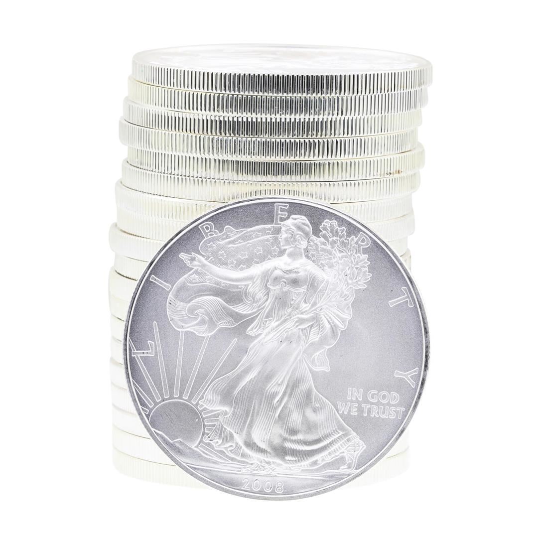 One Roll of (20) 2008 $1 American Silver Eagle Brilliant Uncirculated Coins.