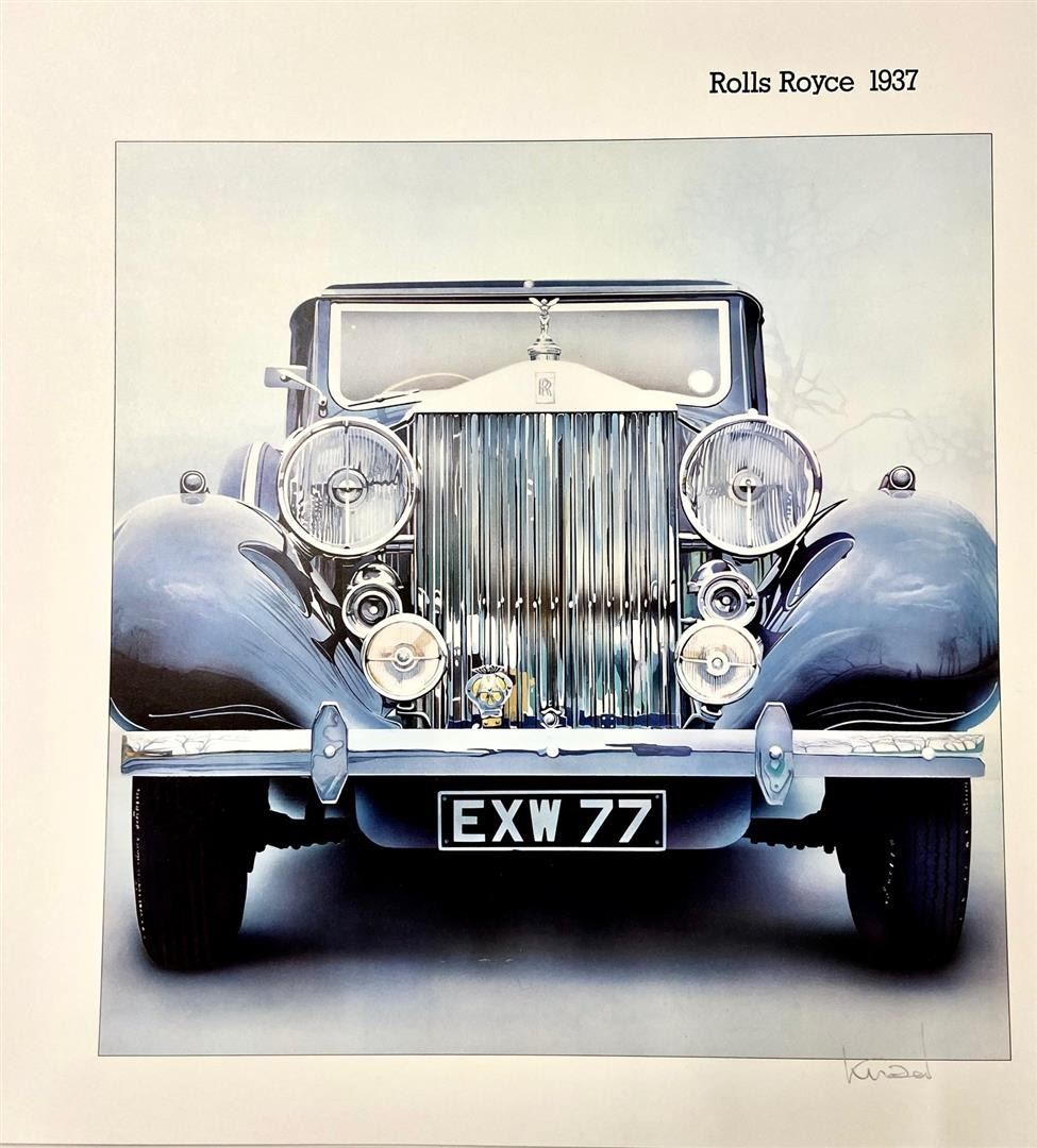 A hand-signed Advertising Poster by Wolfgang Kuzel , 25.5 x 23.5" , of ta classic 1937 Rolls .Signed by Kuzel . Not been framed.