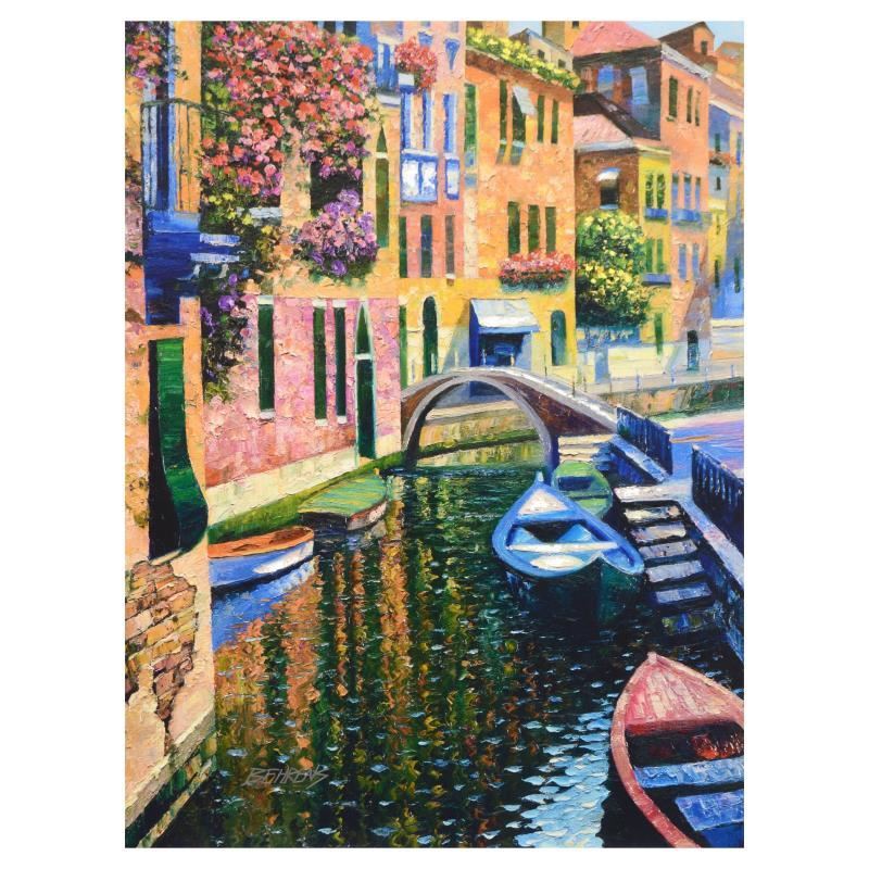 Romantic Canal is a limited edition giclee on canvas by Howard Behrens (1933-2014), numbered and bearing the authorized signature of the artist. This piece is from Behrens Legacy Edition. Includes Certificate of Authenticity. Measures approx. 24 x 32 (image). This item requires special handling and may have a longer than usual turnaround.