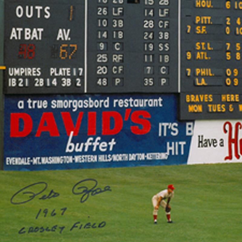 "Rose in Outfield at Crosley" is an archival photograph featuring Pete Rose taken by photographer Sarge Marsh circa 1967. This photo is autographed boldly by Pete Rose. This piece comes framed. Includes Certificate of Authenticity. Measures approx. 22" x 26" (frame), 16" x 20" (image).