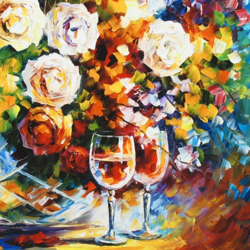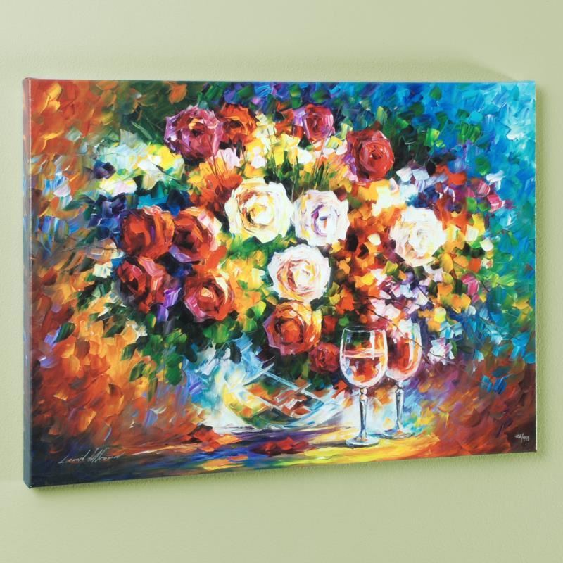 Leonid Afremov's (1955-2019) masterful use of color and texture make his paintings unique collectibles that are sure to brighten any wall. "Roses and Wine" is a limited edition giclee on canvas. The piece is numbered and bears the artist's authorized signaturet. This piece comes gallery wrapped. Includes Letter of Authenticity. Measures approx. 24" x 18" (image).