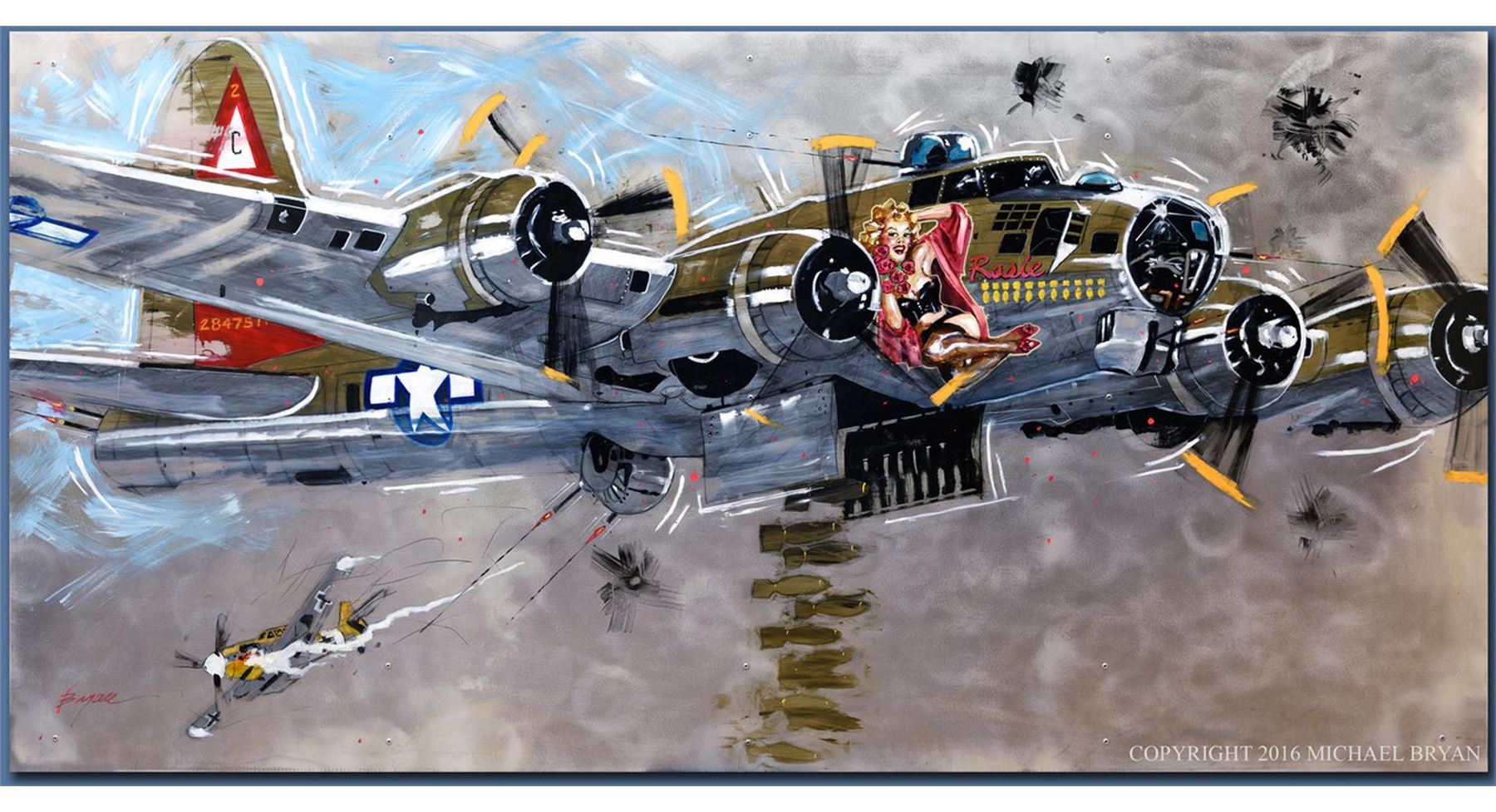 A visit from Rosie is in store for the enemy in this tribute to WWII fighter pilots by Michael Bryan. This is a handworked giclee on canvas 20x40" numbered 1/1.