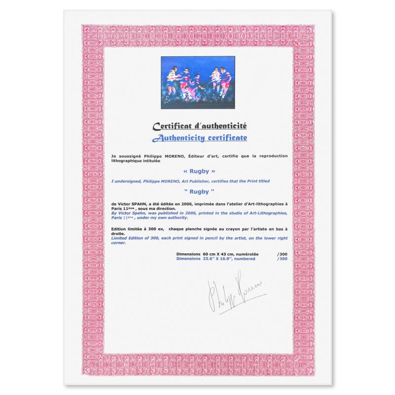 "Rugby" is a limited edition lithograph on paper by Victor Spahn. Printed at Art-Lithographies workshop in Paris, the piece is hand signed by the artist and comes with a certificate of authenticity. This piece is custom framed. Measures approximately 25" x 31.5" (frame), 17" x 23.5" (image).