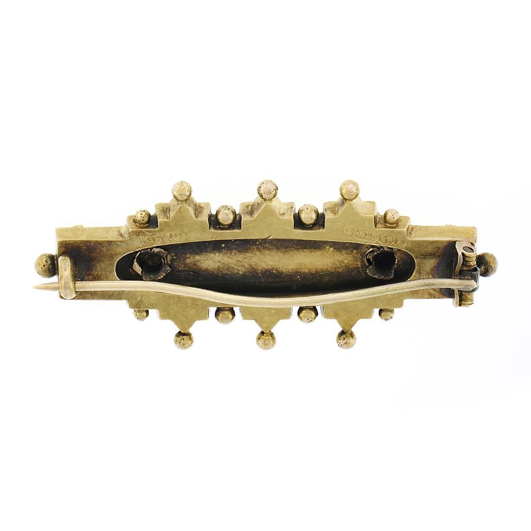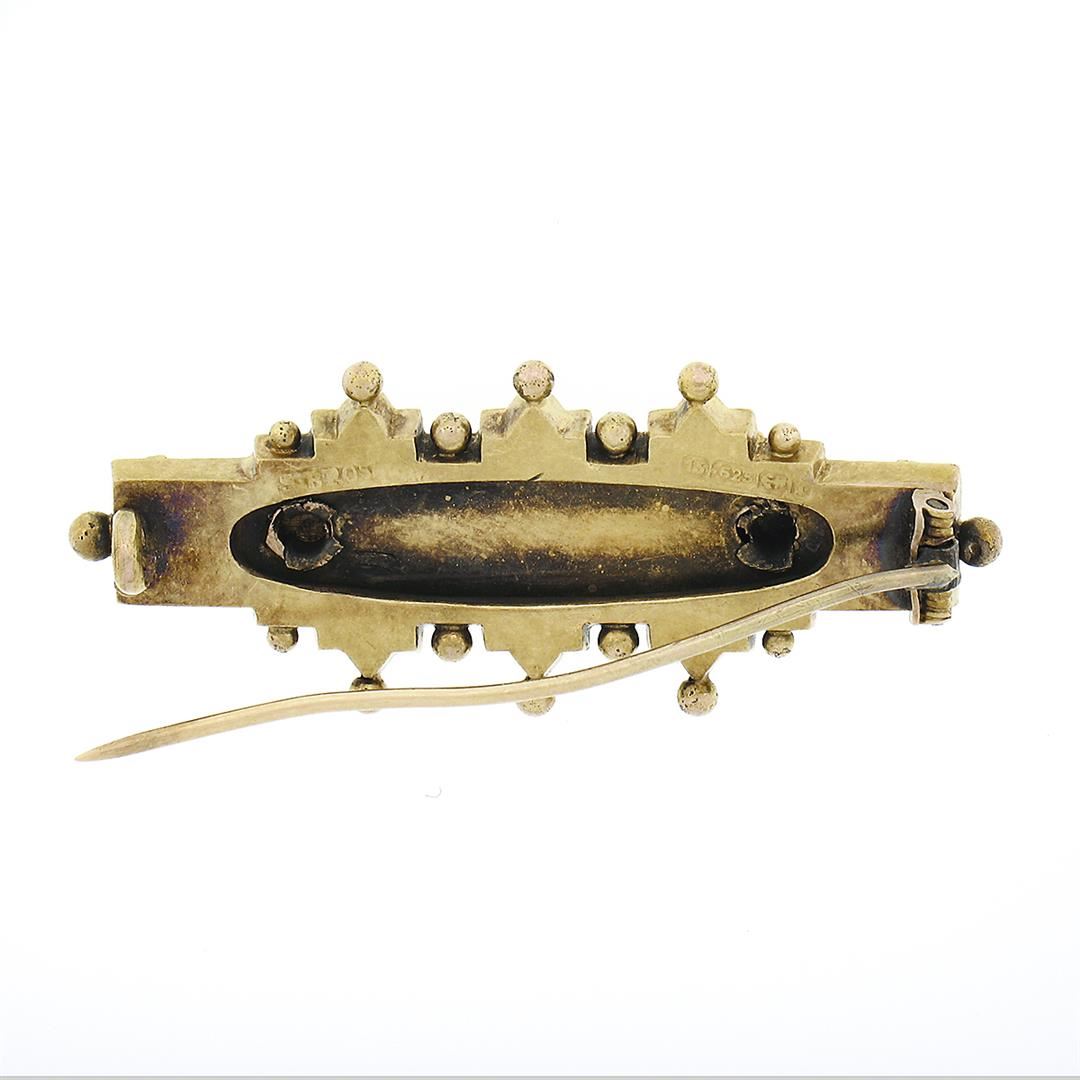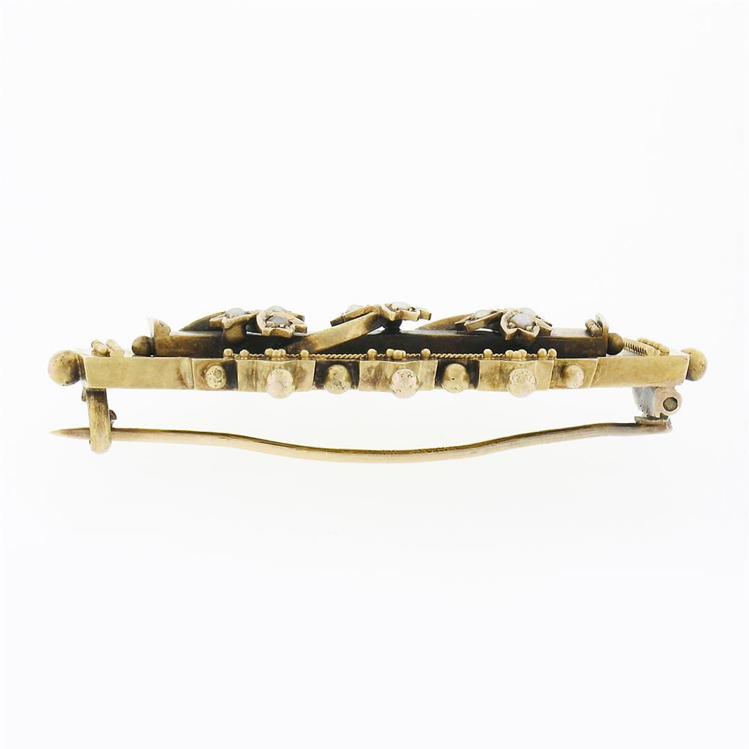 An antique solid 15k yellow gold bar pin brooch by S. Bros, with 9 round shape cultured seed pearls (1.3mm each). Measures 42.70x17.0mm and weighs a total of 3.93 grams.