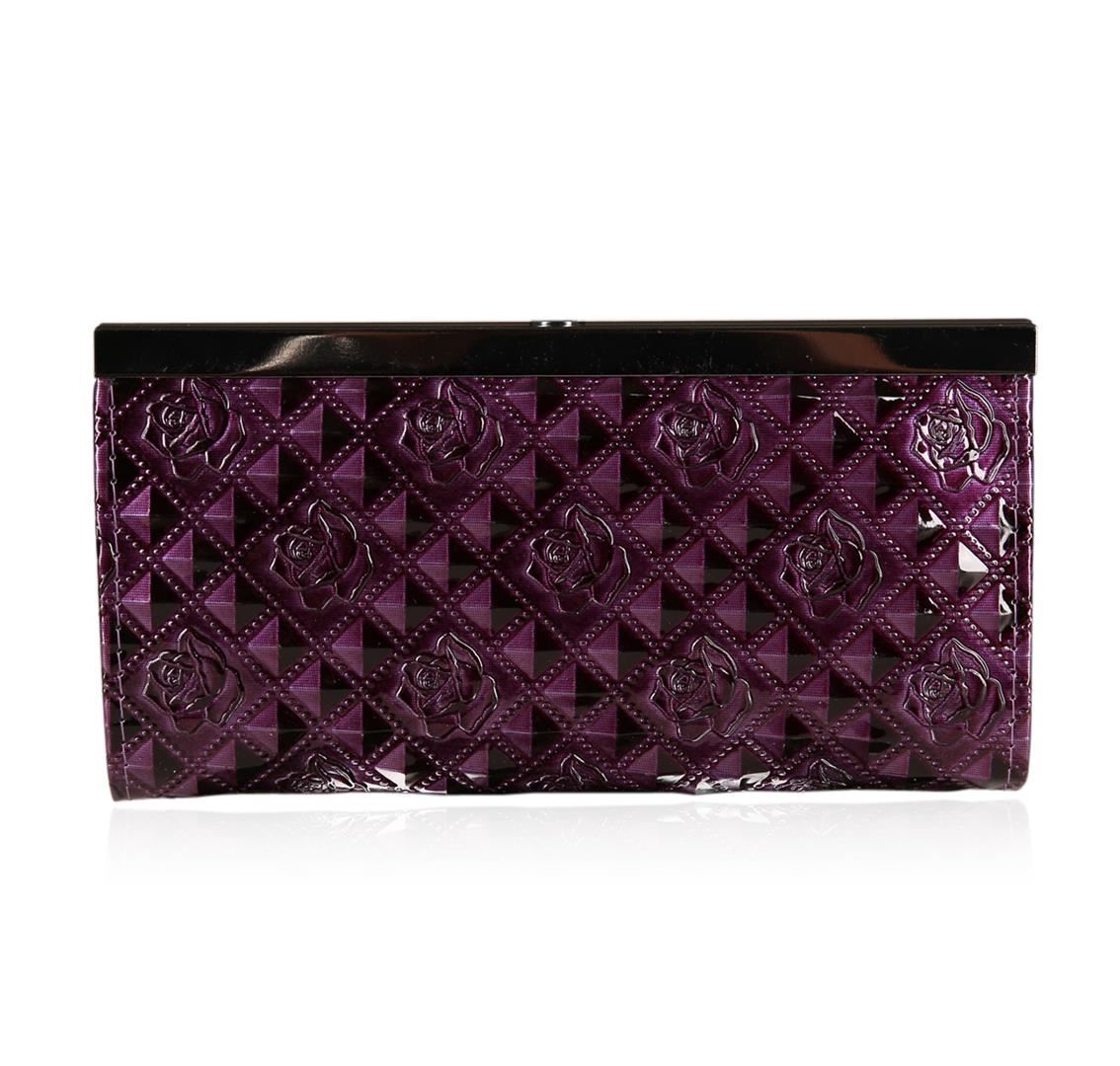 A SCP Wallet embellished with stones. Purple Patent. Embossed with Roses.