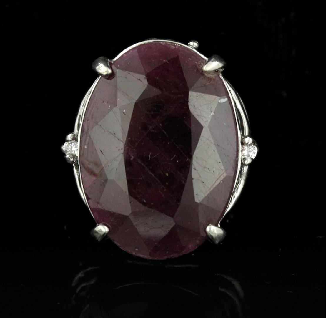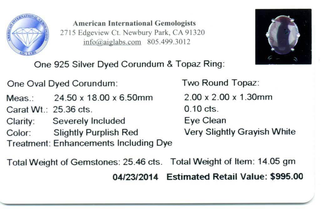 One electronically tested 925 silver ladies cast dyed corundum and white topaz ring with a bright polish finish. The featured dyed corundum is supported by a lattice under gallery and accented by a single white topaz on either side. The ring is completed by a three millimeter wide band. Identified with markings of "925". Condition is new, good workmanship. Containing: One prong set oval mixed cut natural dyed corundum, measuring 24.50 x 18.00 x 6.50mm, 8% bulge factor, approximate weight of 25.36ct, clarity is severely included, dark, very slightly brownish, slightly purplish red color, (GIA slpR 7/3), cut is good. Transmitting light very diffusely, translucent and opaque. Naturally occurring internal & external characteristics are present. Indications of multiple laboratory enhancements, including dye. The presence of dye prevents determining whether this stone would have sufficient depth of color to be considered Ruby. Graded in the setting. Two prong set round mixed cut natural white topazes, measuring 2.00 - 2.00 x 1.30 mm, approximate total weight of 0.10ct, clarity is eye clean, colorless, very slightly grayish, white color, (GIA W 0/3), cut is good. Transmitting light with no distortion, transparent. Color grade is an average for the pair. Graded in the setting. Total Weight of Colored Stones 25.46 ct. Total Weight of Ring 14.05 grams AIG Appraised.