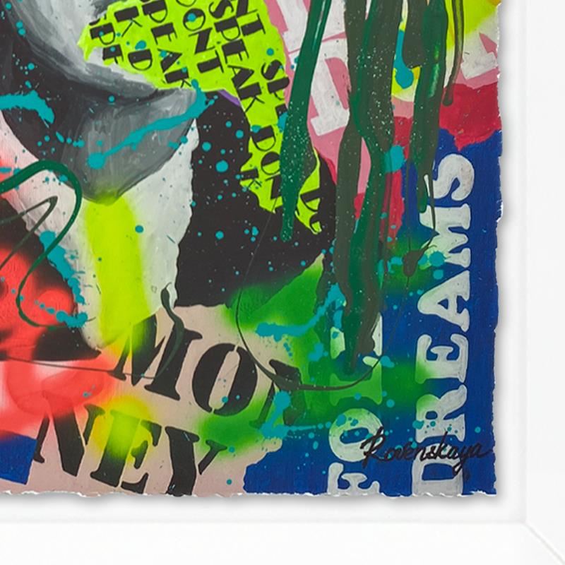 "SUP" is a one-of-a-kind mixed media on deckle edge paper by Nastya Rovenskaya, Hand signed by the artist. This piece comes floating in a custom frame. Includes Letter of Authenticity. Measures approximately 23" x 28" (framed), 19" x 24" (image).