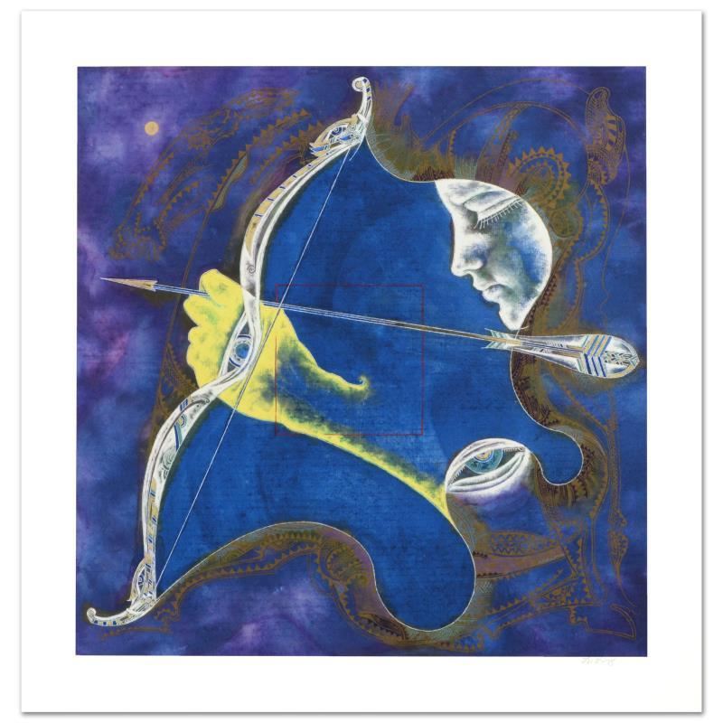 The zodiac is a phenomenological study, formed by coordination between 12 specific constellations in space and birth of one specific human being in time, contrasting 12 signs that guide the meditation of love, fate and purpose of one's life. "Sagittarius (11/23 - 12/20)" is a limited edition giclee on paper by talented Chinese artist Lu Hong, numbered and hand signed by the artist! Measures approx. 24" x 24" (with border), 20" x 20" (image).
