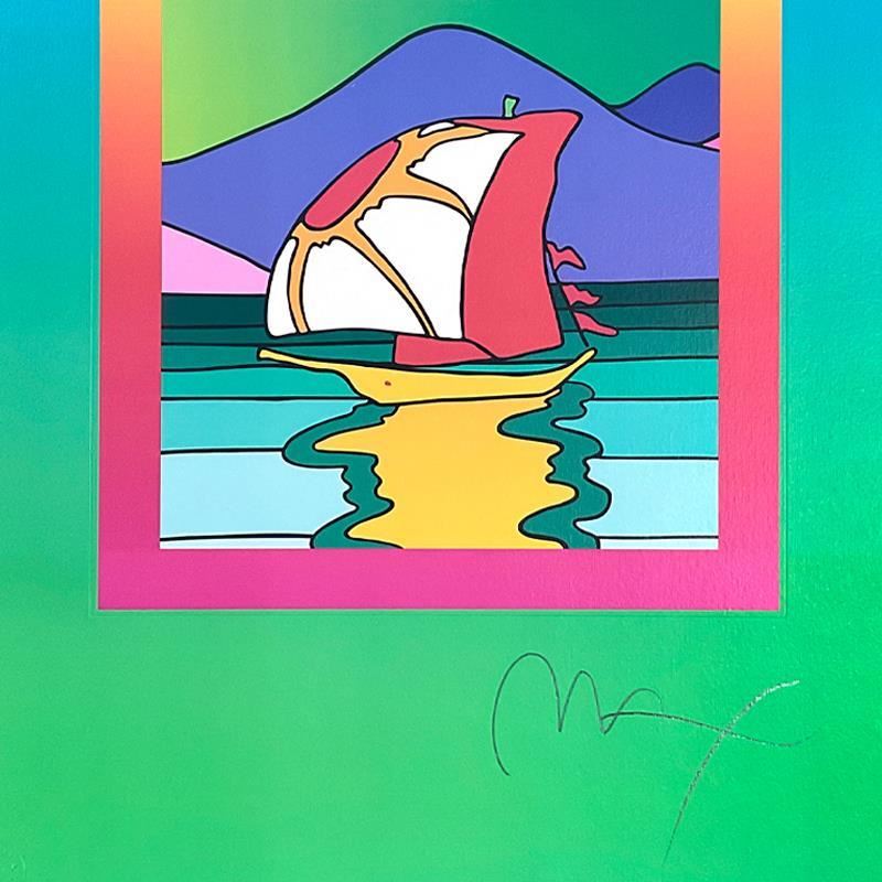 "Sailboat East on Blends" is a limited edition lithograph on paper by Peter Max numbered and hand signed by the artist. This piece comes framed. Includes Certificate of Authenticity from Peter Max Studios. Measures approx. 27" x 23" (frame) 17" x 13" (image).