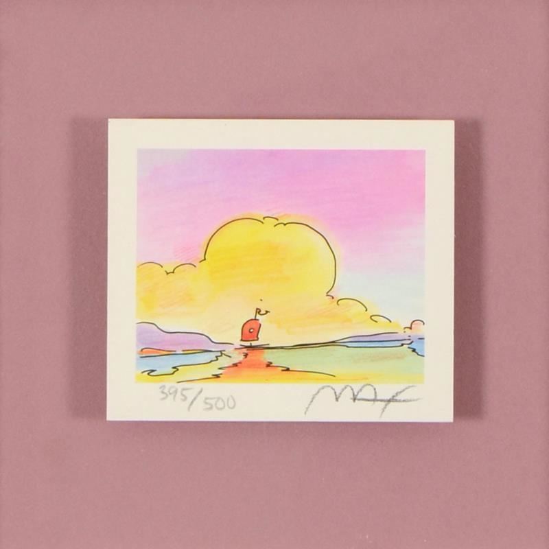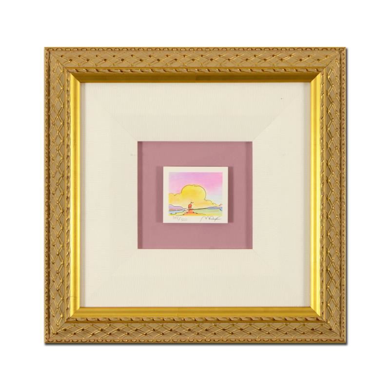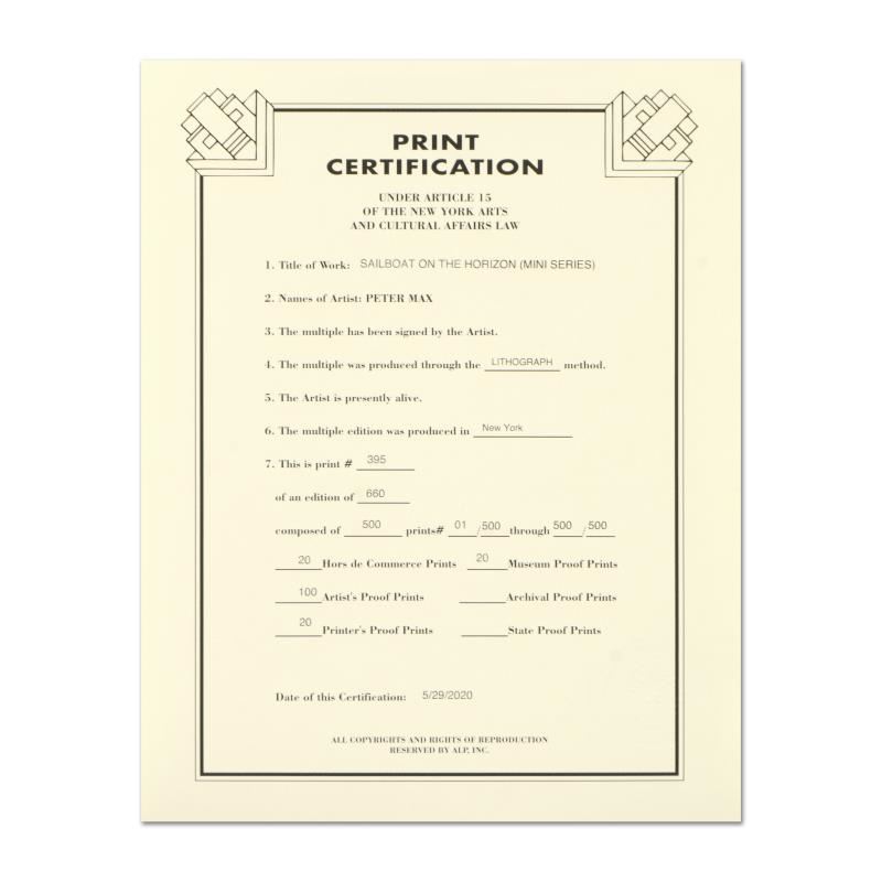 "Sailboat on the Horizon" is a limited edition lithograph on paper by Peter Max, numbered 395/500 and hand signed by the artist. This piece comes framed and includes Certificate of Authenticity. Measures approximately 14.5" x 14.5" (frame), 2.5" x 3" (image).