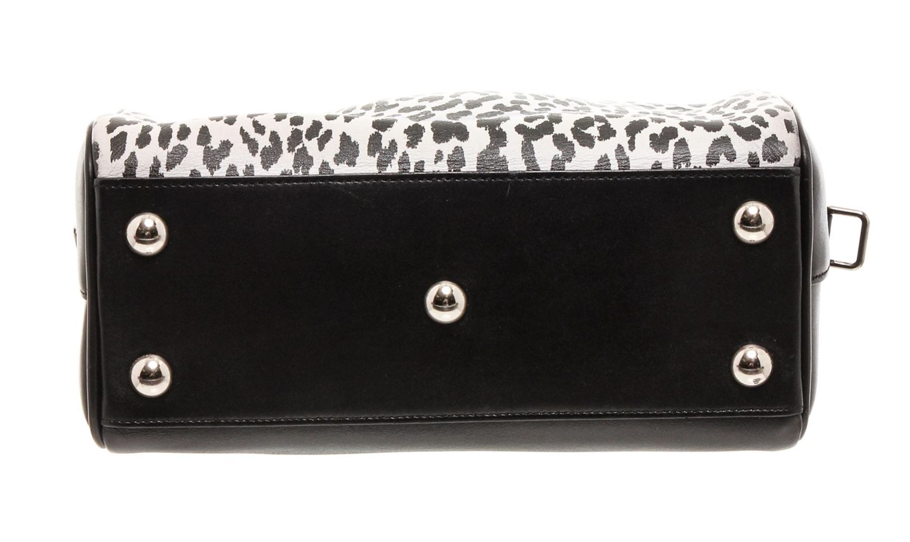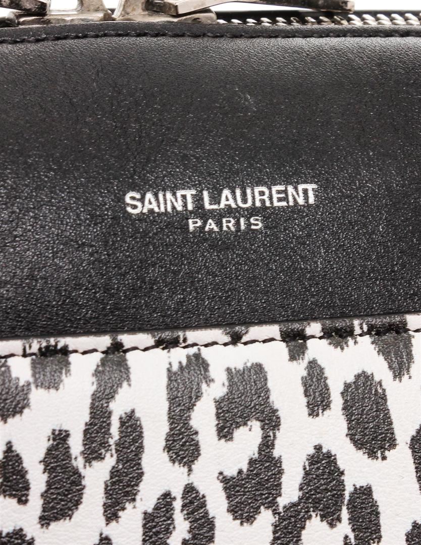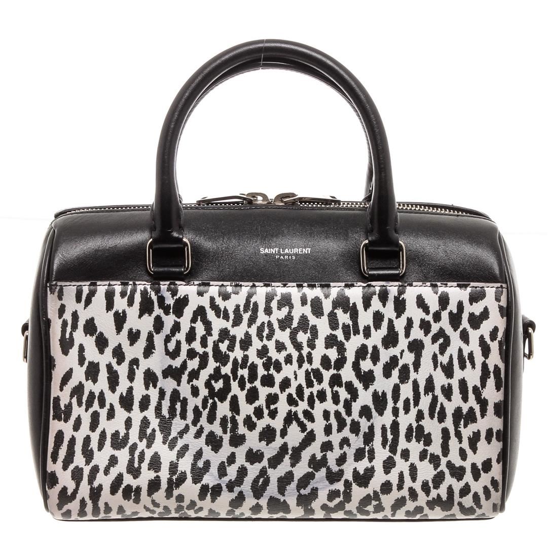 Black and white Cheetah print leather Saint Laurent YSL Classic Baby Duffle bag with silver-tone hardware, dual rolled top handles, foil-stamped logo at front, protective feet at base, tonal suede interior lining and zip closure at top. Detachable flat leather shoulder strap.