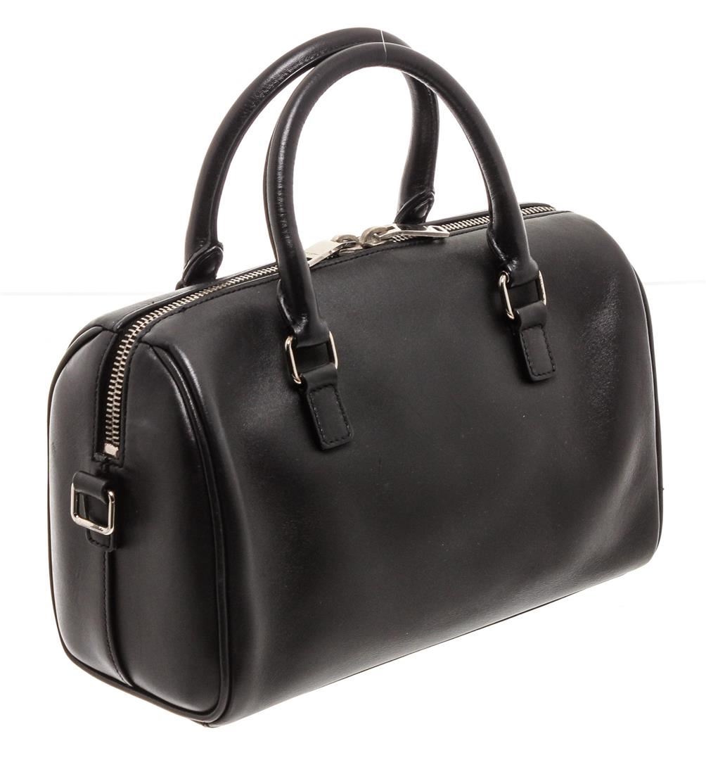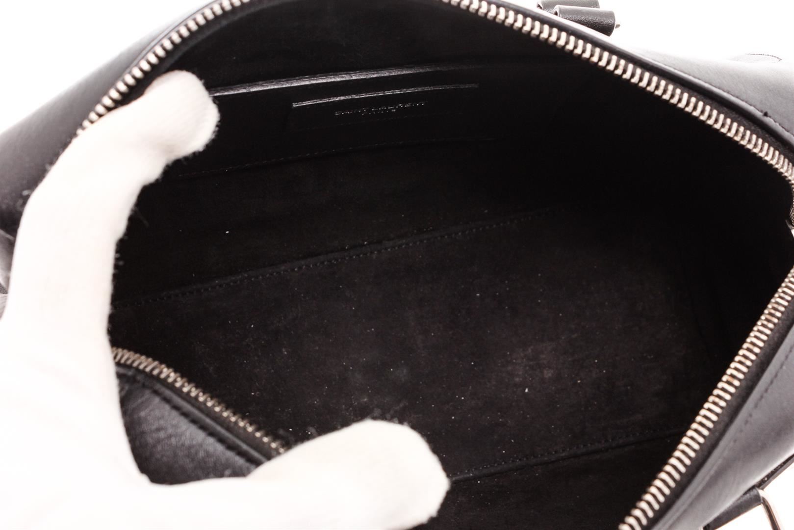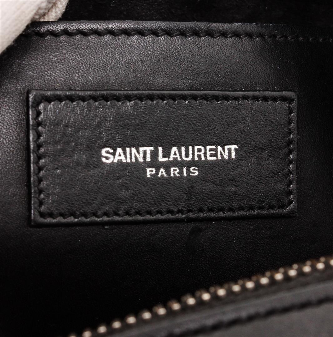 Black and white Cheetah print leather Saint Laurent YSL Classic Baby Duffle bag with silver-tone hardware, dual rolled top handles, foil-stamped logo at front, protective feet at base, tonal suede interior lining and zip closure at top. Detachable flat leather shoulder strap.