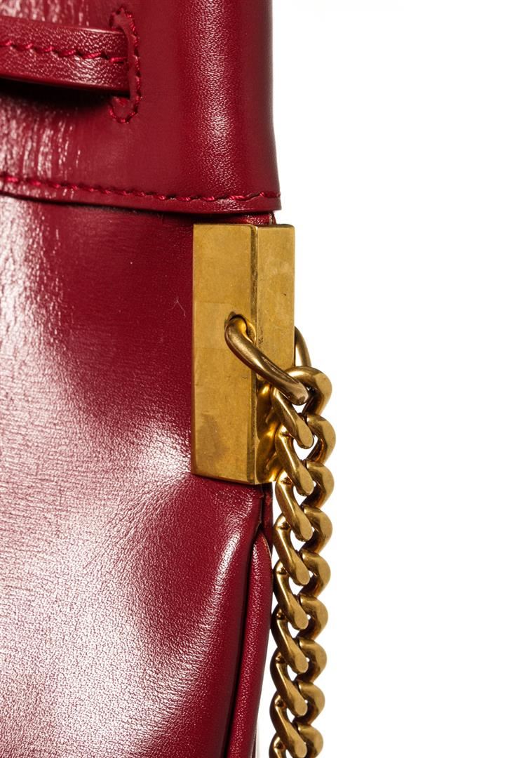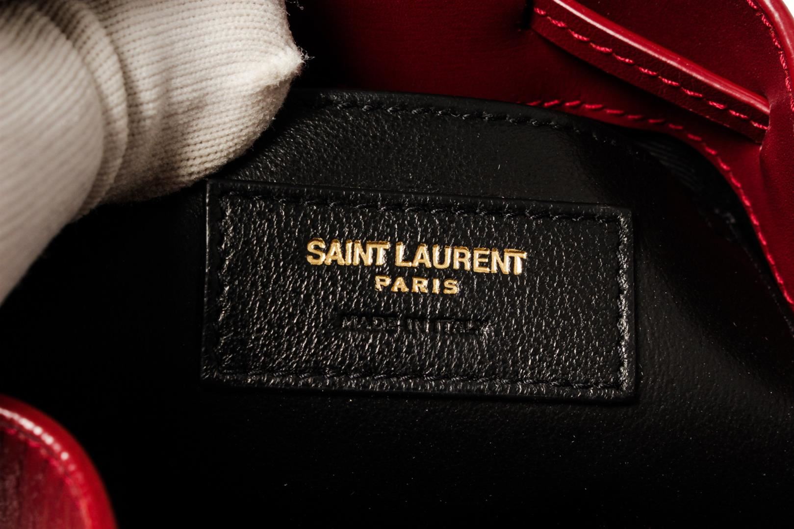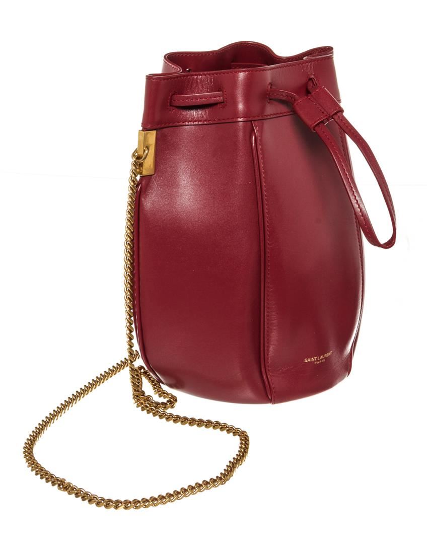 One Saint Laurent YSL Burgundy Smooth Leather Talitha Bucket Bag. Item is sold AS-IS. All available information is listed in the description and shown in the photo. Burgundy leather Saint Laurent Talitha bucket bag with antiqued gold-tone hardware, single adjustable shoulder strap, black nylon lining & single interior pocket and a drawstring closure at front. Height: 10.5" Width: 7" Depth: 7" Shoulder Strap Drop: 16" - 20"