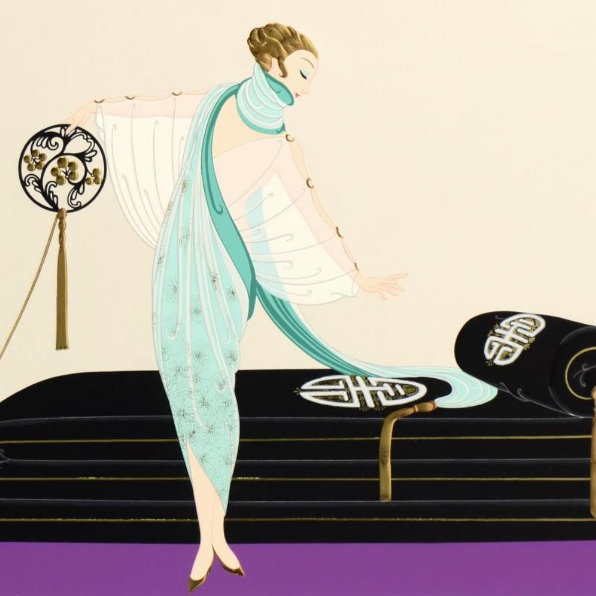 "Salon" is a limited edition embossed serigraph on paper by Erte (1892-1990), numbered and hand signed by the artist. Includes Certificate of Authenticity. Measures approx. 30" x 21.5" (with border), 24" x 18" (image). There is a minor crease on the top-right corner of the white border area that may be concealed when framed.