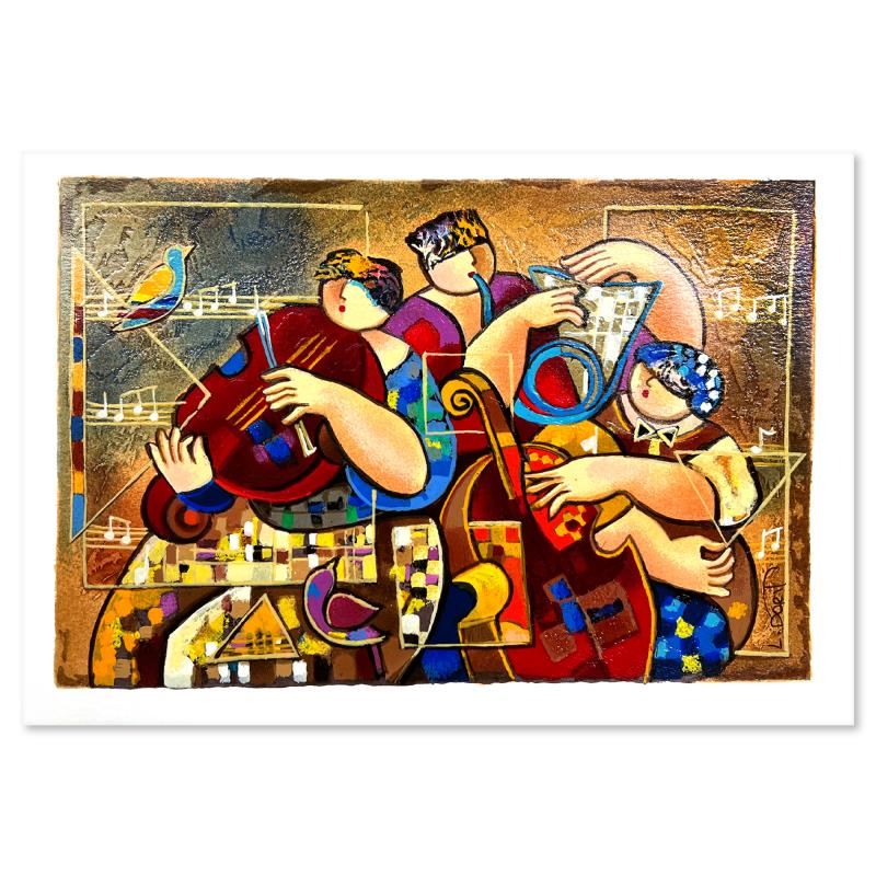 "Salsa Fun" is a limited edition serigraph on paper by Dorit Levi. The piece comes hand signed by the artist, numbered, and with a letter of authenticity. Measures approximately 8" x 11.5".
