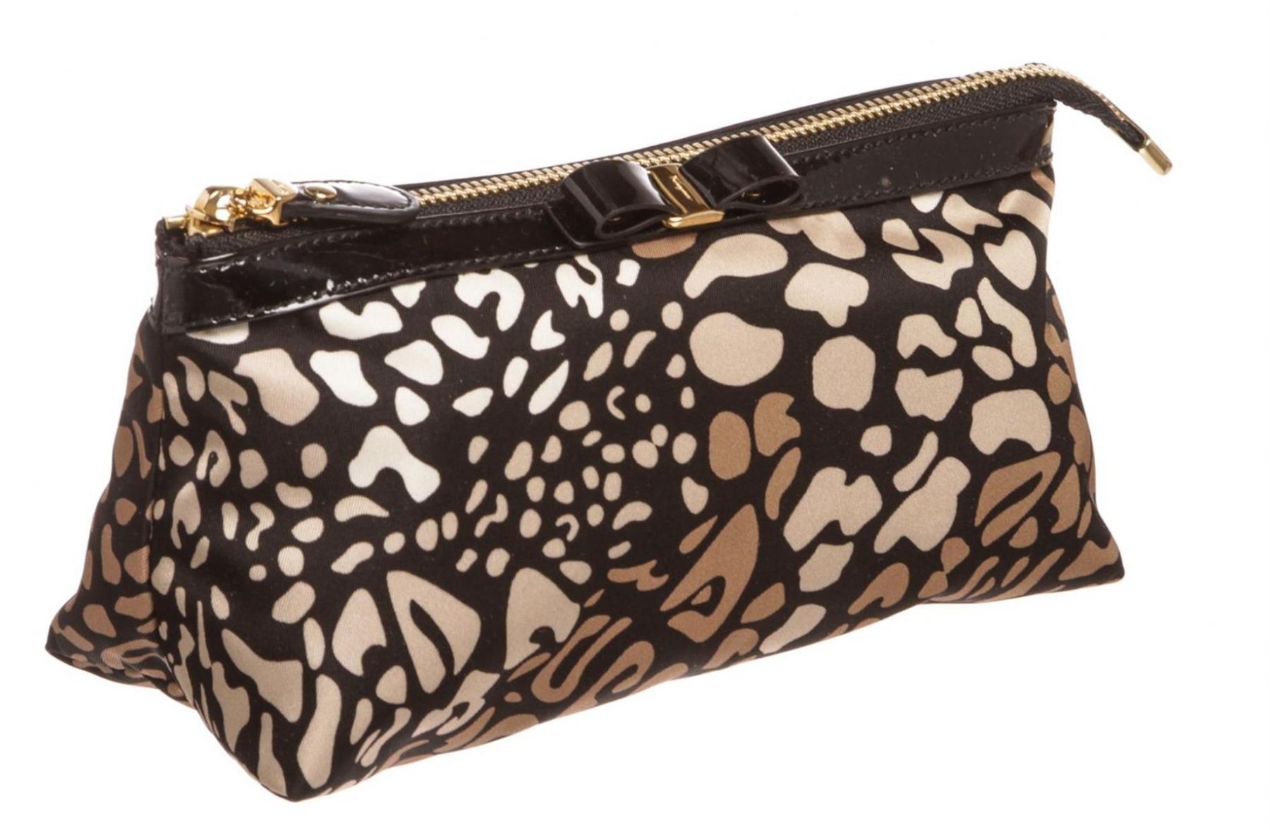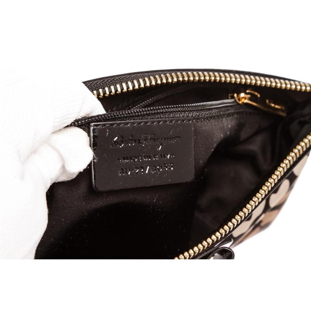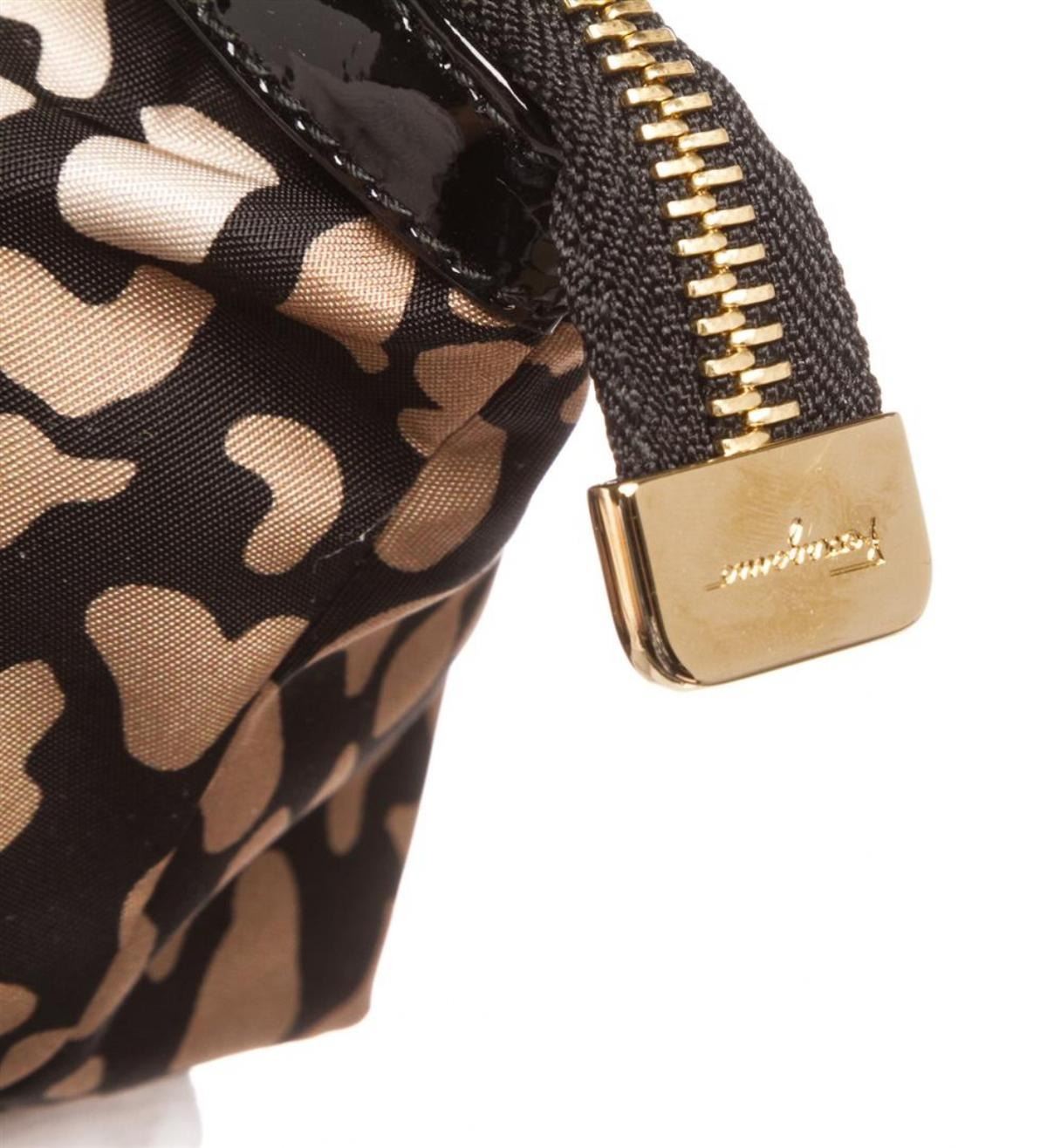 Animal print Salvatore Ferragamo nylon patent Leather small cosmetic bag with black nylon interior lining, one zipper pocket at interior wall and overall zipper closure. Includes Box.