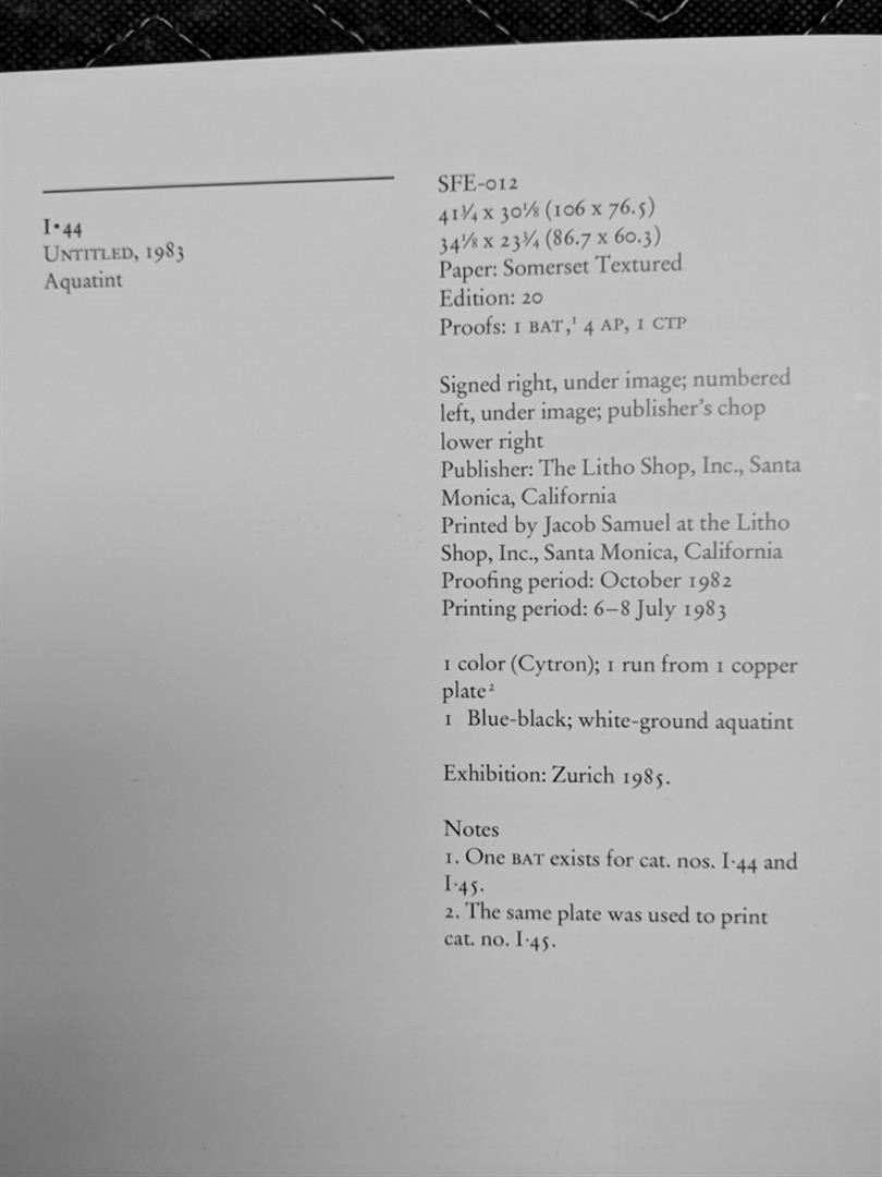 Sam Francis left this aquatint etching Unititled, but it is part of a series of Star of David images he did throughout his career. This on is Museum framed and matted, measuring O.D. 53x43". Gallery Price $3500 for this one.