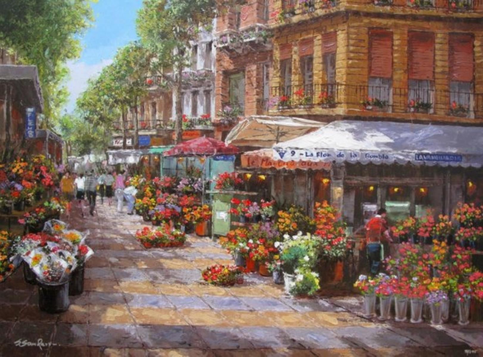 Sam Park "BARCELONA FLOWER MARKET" Hand Signed and Numbered Limited Edition Embellished Giclee on Canvas Dimensions: 24 x 32 inches (Note: edition number received may differ from photo)