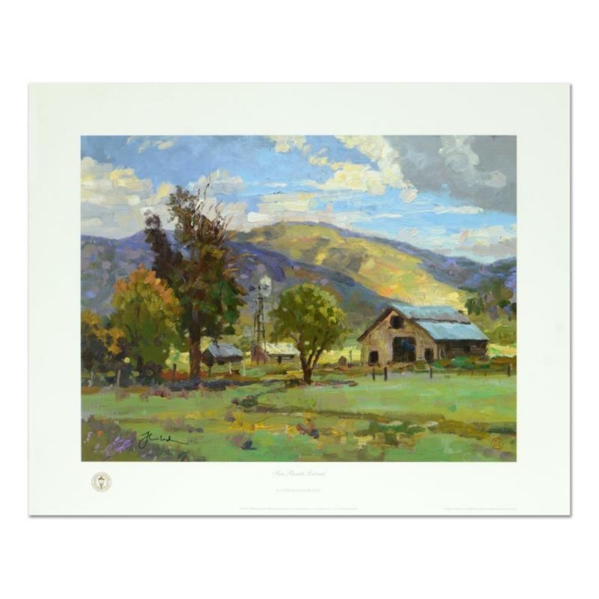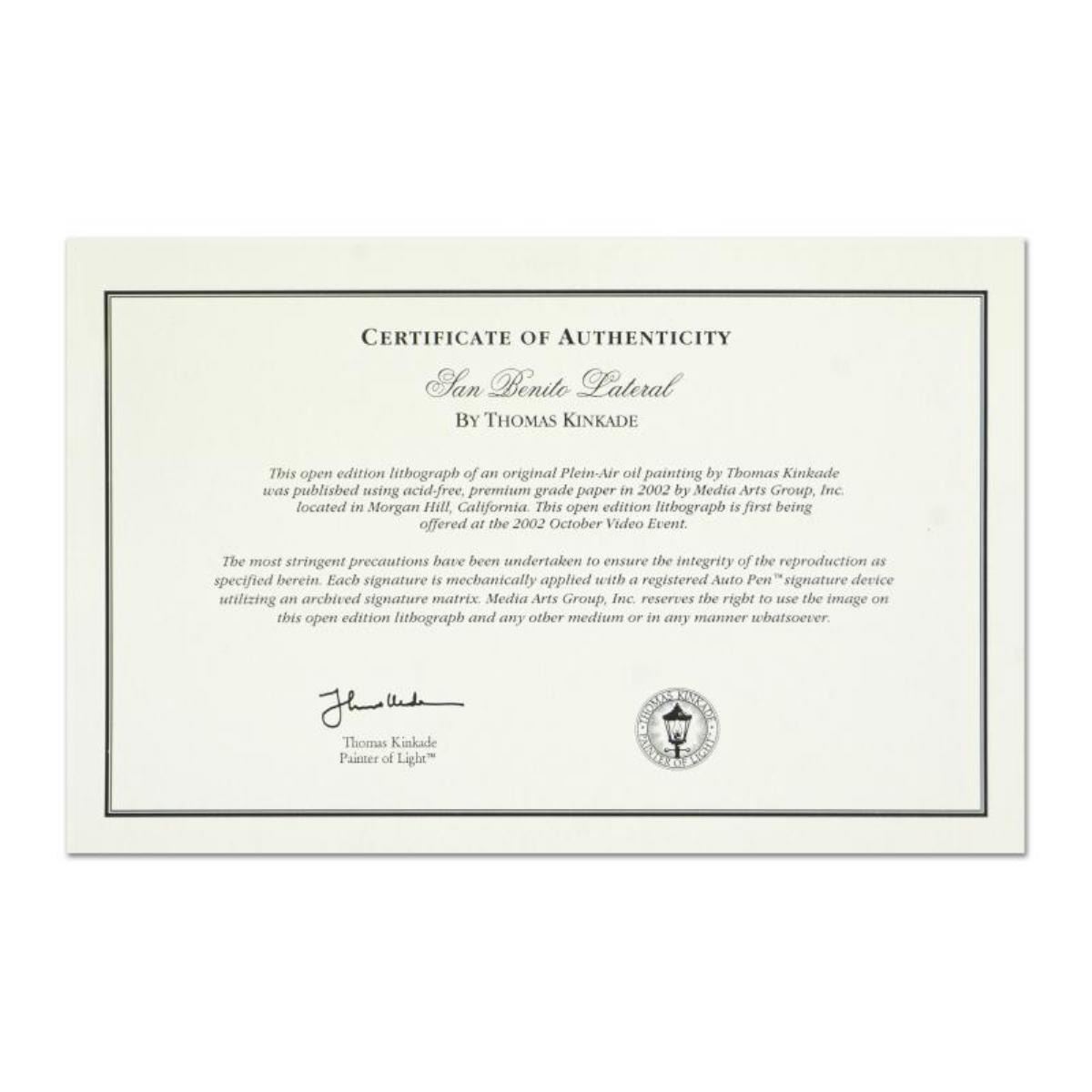 "San Benito" is an offset lithograph on paper from an open edition by Thomas Kinkade (1958-2012), bearing the Kinkade's authorized signature. Includes Letter of Authenticity from Lighthouse Publishing. Measures approx. 20" x 16" (border), 16" x 12" (image).