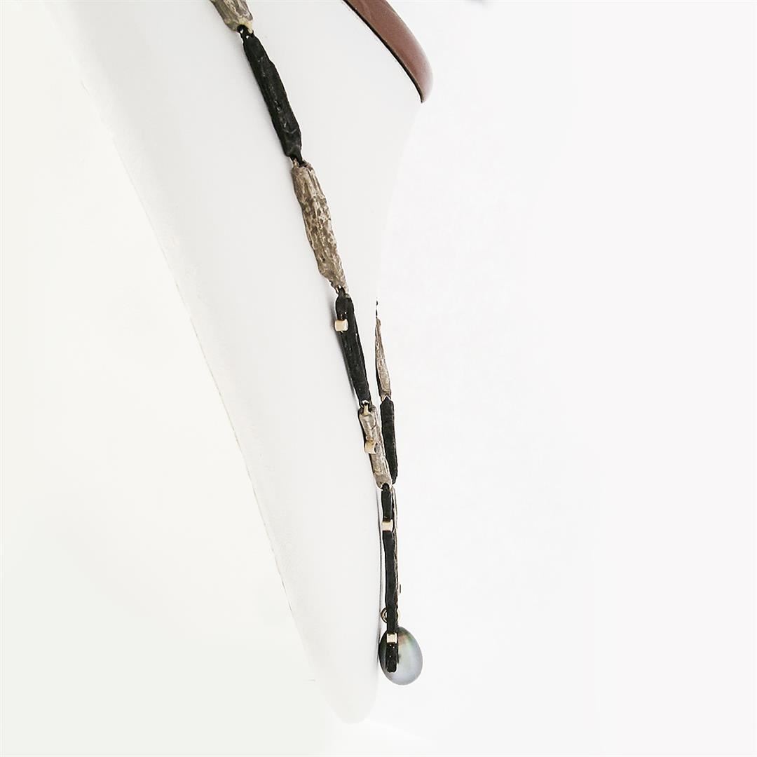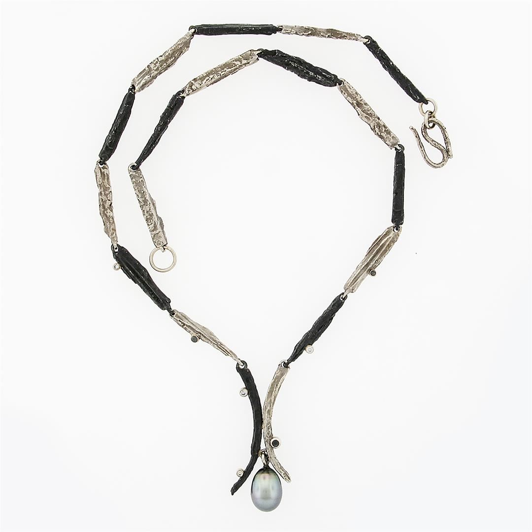 A Sarah Graham chrome & 18k white gold necklace, with 1 oval drop shape natural tahitian pearl (12.67x9.10mm), and 4 round brilliant cut natural diamonds (F - VS1; 0.08ctw ), and 3 round brilliant cut natural black diamonds (0.06ctw ). 17 inch cobalt chrome and "manzanita bark" link chain, 41.41 grams total weight, pendant width measures 15.55mm.