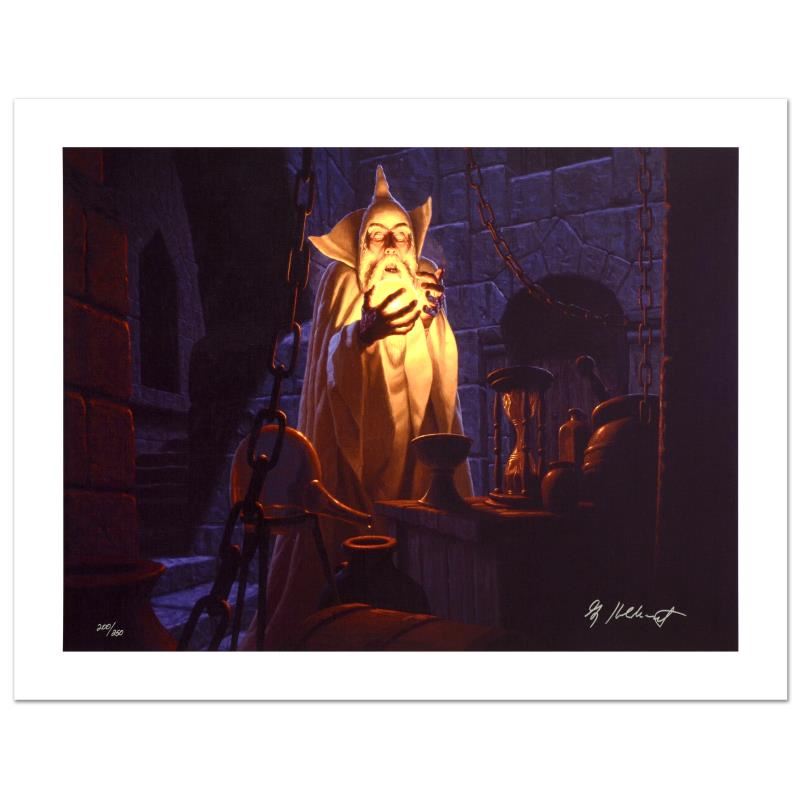 Known world wide for their fantasy and science fiction illustrations, identical twin brothers Greg and Tim Hildebrandt created an abundance of fascinating artwork, most notably their illustration work for J.R.R. Tolkien's 'The Hobbit' and 'Lord of the Rings'. "Saruman And The Palantir", originally created in the 1970's for Ballantine Books, is a limited edition giclee on canvas, numbered and hand signed by Greg Hildebrandt! Includes Certificate of Authenticity! Measures approx. 28" x 21" (image).