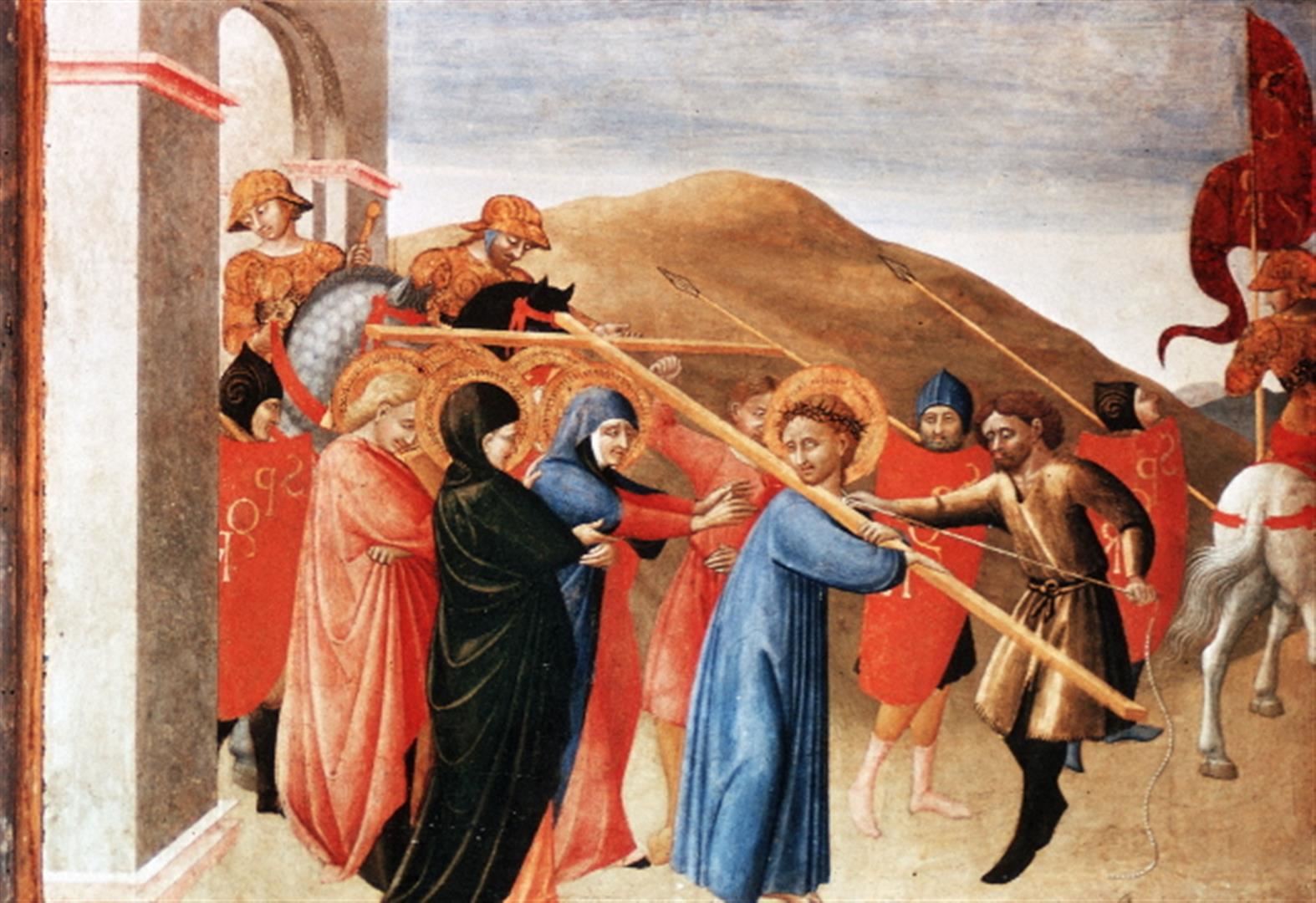 Artist: Sassetta - Title: Christ Carrying the Cross - Medium: Fine Art Giclee on Canvas - Image Size: Approximately 32 inches x 22 inches - Unframed on Unstretched Canvas - Biography: Stefano di Giovanni di Consolo, known as il Sassetta (ca.1392-1450 or 1451) was an Italian painter who is considered one of the most important representatives of Sienese Renaissance painting. While working within the Sienese tradition, he innovated the style by introducing elements derived from the decorative Gothic style and the realism of contemporary Florentine innovators as Masaccio.