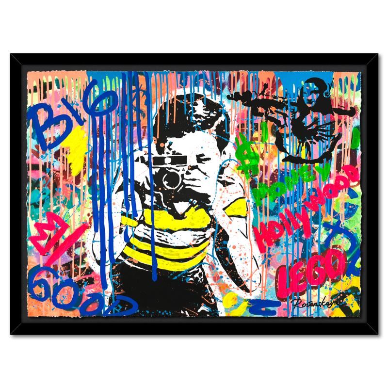 "Say Cheese" is a one-of-a-kind mixed media on deckle edge paper by Nastya Rovenskaya; hand signed by the artist. This piece comes custom framed and includes letter of authenticity. Measures approximately 36" x 46" (framed), 30" x 40" (image).
