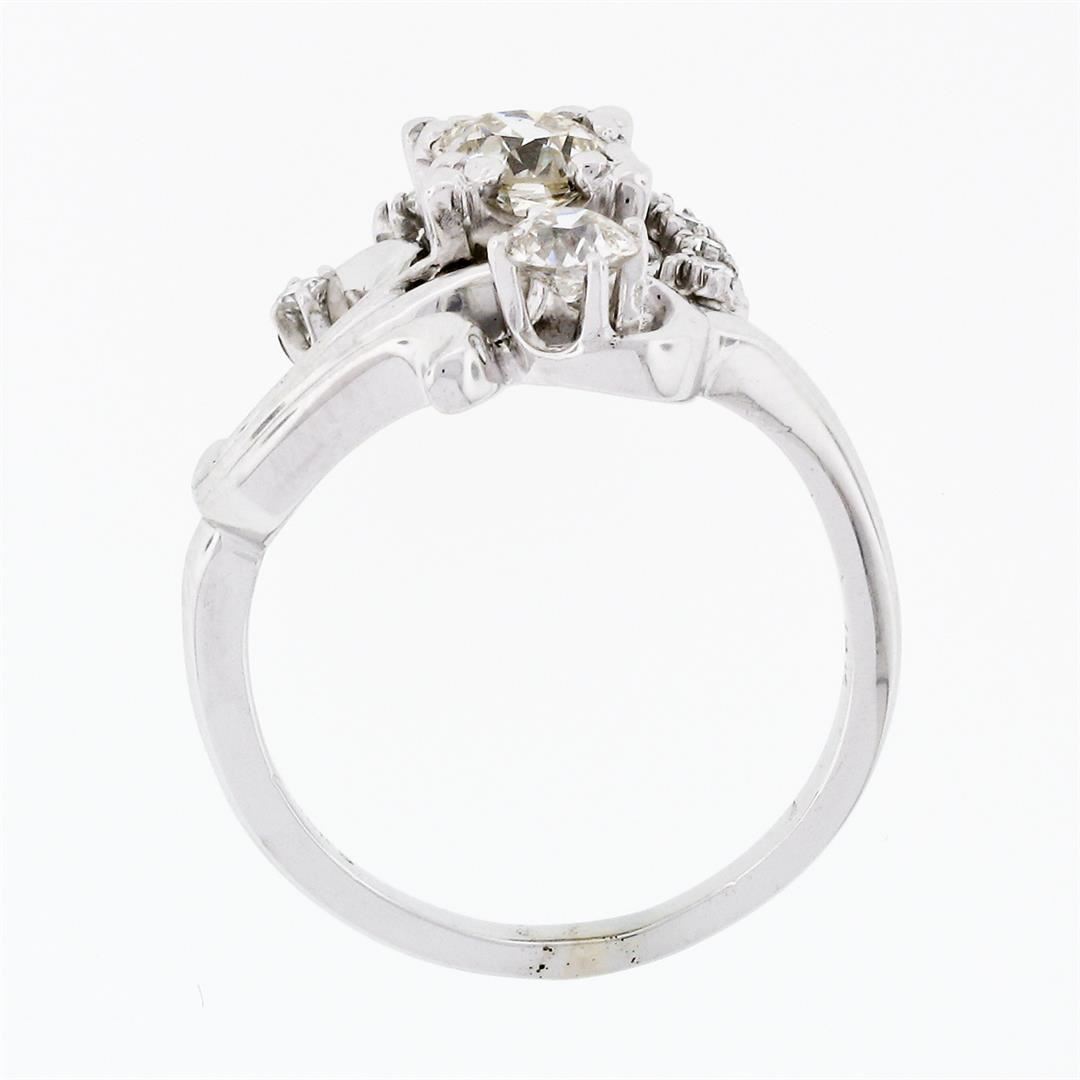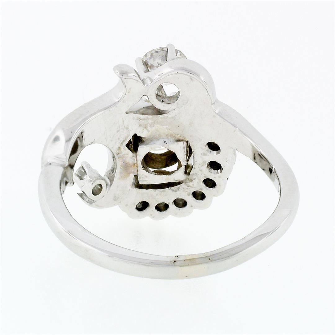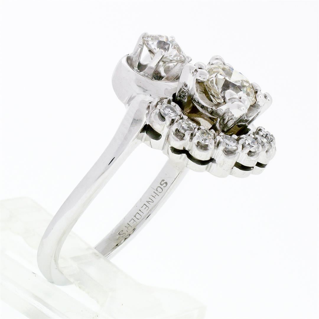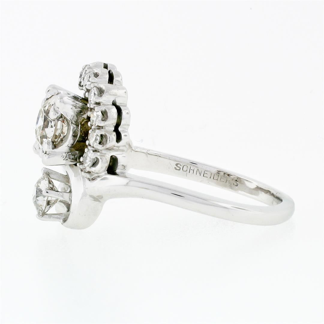 An antique solid 18k white gold cocktail ring by Schneider's, with 2 old european cut natural diamonds (I - VS2 ; 0.73ctw), and 8 old single cut natural diamonds (H/I - VS1/VS2 ; 0.15ctw). The ring is size 6, weighs a total of 6.0 grams, and measures 14.75mm wide.