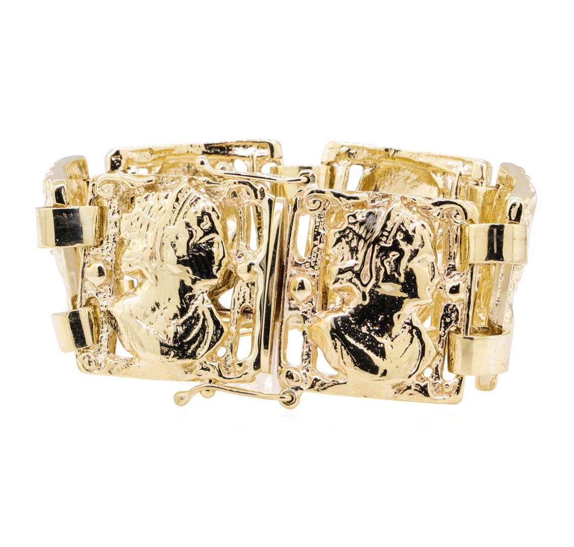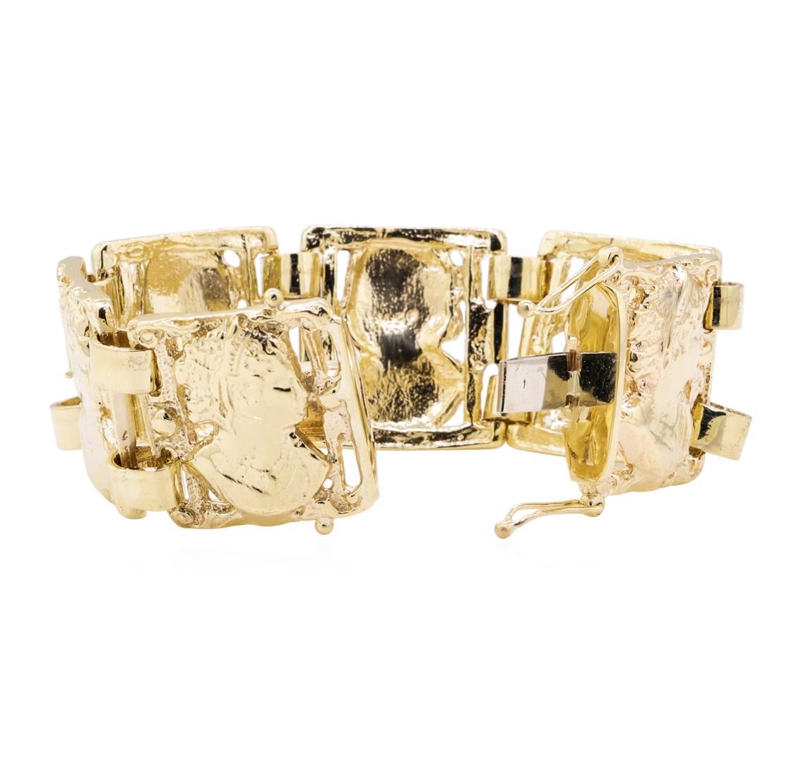 One sculpted station bracelet featuring: 14KT yellow gold weighing 59.5 grams. The bracelet measures approximately five and a half inches in length and 23 millimeters wide. The bracelet features lady's sculpted face motif links.