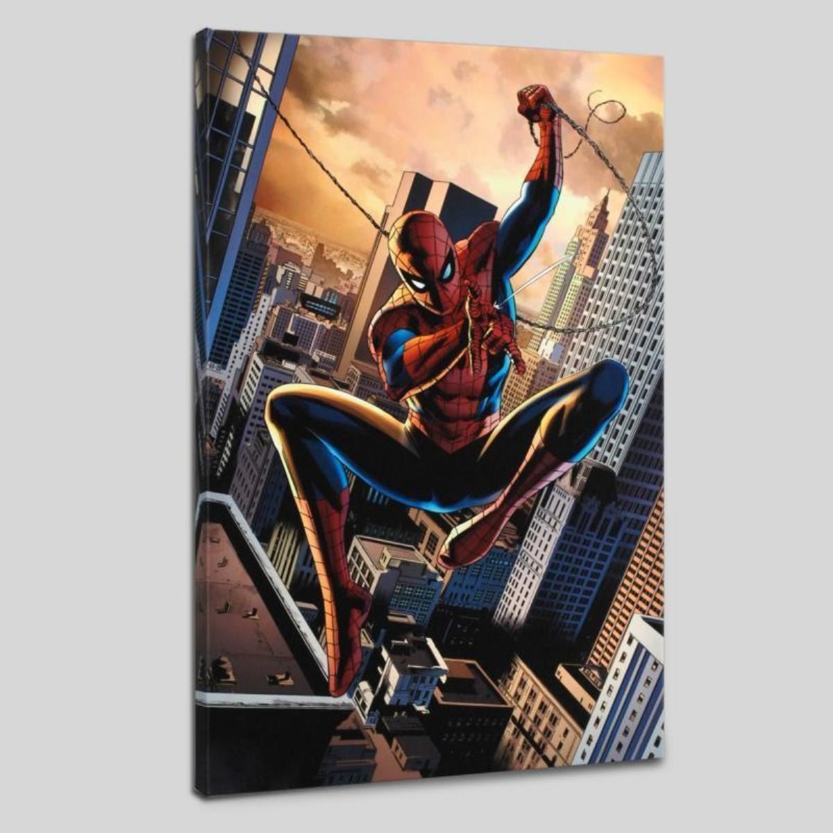 A piece of comic book history, this limited edition, from original art by Gabriele Dell'Otto, depicts an intense Spider-Man. In 1998 Dell'Otto started collaborating with the European division of Marvel Comics, producing covers, posters and lithographies for Italy, France and Germany. In 2002, his work was shown to the editor-in-chief of Marvel Comics, who entrusted to him with the art for the Secret War mini-series. "Secret War #4" is a limited edition numbered giclee on canvas by Gabriele Dell'Otto presented by Marvel Comics. This piece comes gallery wrapped. Includes Certificate of Authenticity! Measure approx. 18" x 27" (image).