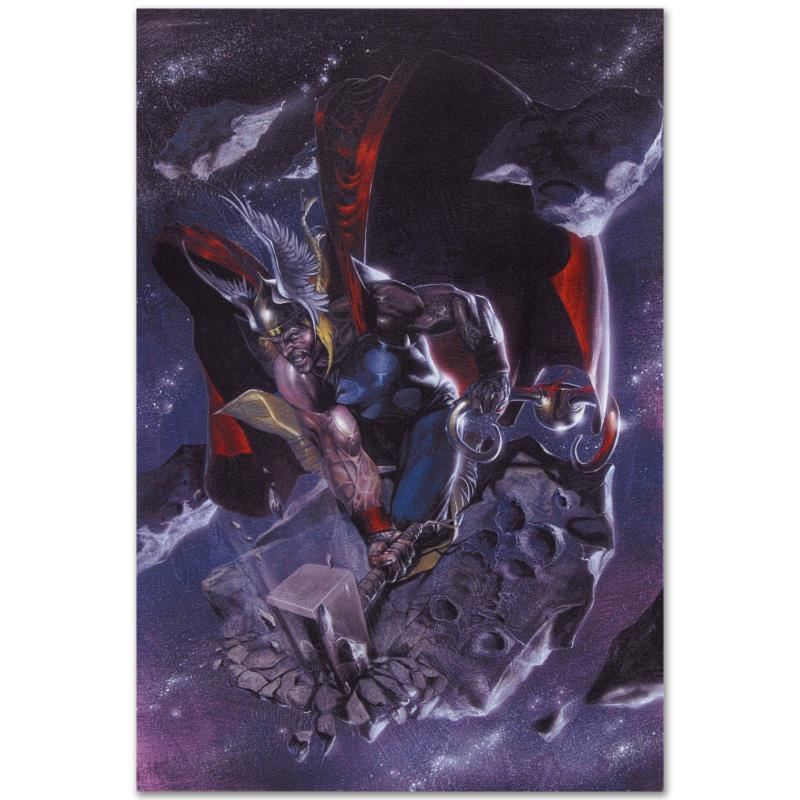 A piece of comic book history, this limited edition, from original art by Gabriele Dell'Otto, depicts an enraged Thor. In 1998 Dell'Otto started collaborating with the European division of Marvel Comics, producing covers, posters and lithographies for Italy, France and Germany. In 2002, his work was shown to the editor-in-chief of Marvel Comics, who entrusted to him with the art for the Secret War mini-series. "Secret War #4" is an extremely limited edition numbered giclee on canvas by Gabriele Dell'Otto presented by Marvel Comics. This piece comes gallery wrapped. Includes Certificate of Authenticity! Measures approx. 18" x 27" (image); 1.5" (depth).