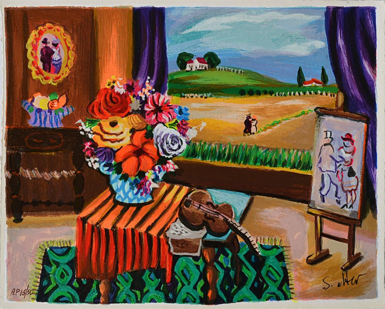 Artist: Shlomo Alter - Title: Artists Studio - Medium: Serigraph on Fine Art Paper - Signature: Hand-signed by the Artist - Limited Edition: AP50 - Paper Size: Approximately 9 inches x 11.5 inches - Unframed - Details: This work comes with a Certificate of Authenticity - Biography: Shlomo Alter was born in Romania to a family of restaurateurs. He emigrated to Israel in 1948 and during high school he started to study painting under the well known artist Aaron Avni. Some of his early works appeared in UNICEF'S world touring exhibition of young artists. Altar's works are influenced by his early recollections of the well dressed people who gathered in the courtyard of his parent's restaurant in Bucharest to eat and drink, to dance of Gypsy bands, and to enjoy the convivial atmosphere. With a touch of optimism and good humor Alter's art reflects life at its core, an antithesis to the Nazi regime that shattered his childhood happiness. His paintings are like stage set on which the objects relate to each other through a glow of colors and lines - a frozen moment in time, a dynamic stillness prior to a burst of action. His style can best be compared to that of the Expressionists. He uses color to give direct expression to his ideas in influence by the famous, particularly Matisse and Duty.